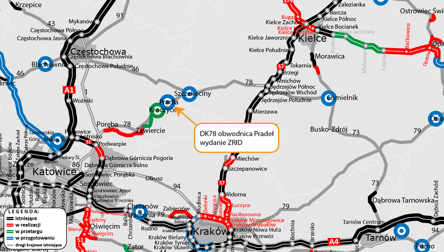 Wspomniane wcześniej obwodnice w ciągu DK78, Kroczyc, Pradeł, Szczekocin i Goleniów powstaną w ramach Programu budowy 100 obwodnic. Podobnie jak kolejna obwodnica w ciągu DK78, Nakła Śląskiego i Świerklańca, dla której opracowywane jest Studium techniczno-ekonomiczno-środowiskowego (STEŚ) wraz z elementami koncepcji programowej. Zadanie przewidziano do realizacji w latach 2029-2031.
