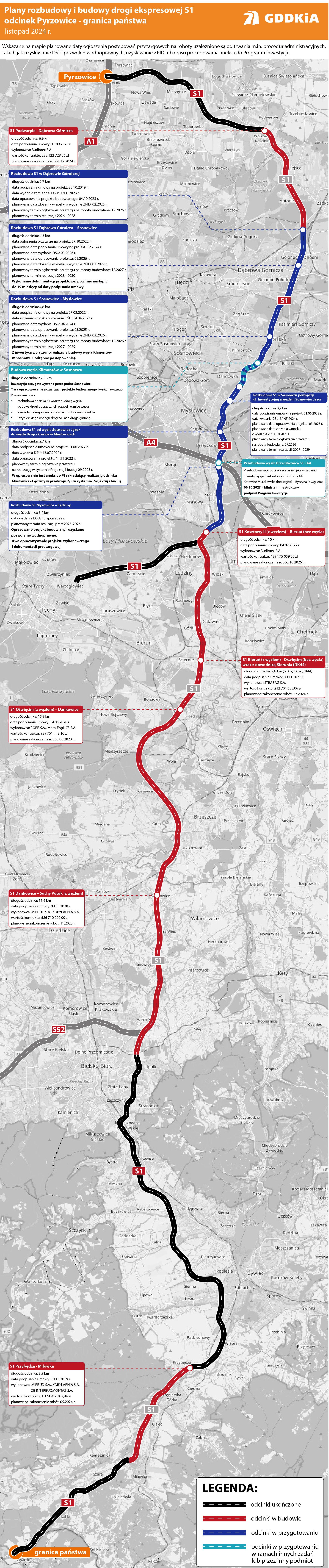 Umowę dla odcinka rozpoczynającego się przed węzłem Porąbka i kończącego na wysokości ul. Inwestycyjnej w Sosnowcu, o długości 4,8 km, podpisaliśmy 7 lutego 2022 r. Dokumentacja obejmuje wykonanie projektu budowlanego i wykonawczego wraz z materiałami do wniosku o wydanie decyzji ZRID. Przewidujemy, że uzyskanie DŚU może nastąpić w II kwartale 2025 r. Inwestycja planowana jest do realizacji w systemie tradycyjnym w latach 2027-2029. Wyłączony z tego odcinka jest ponad kilometrowy fragment projektowany przez miasto Sosnowiec, na którym powstanie węzeł Klimontów. Oba te zadania muszą zostać zrealizowane jednocześnie z uwagi na rozwiązania projektowe węzła Klimontów (konieczność zachowania rzędnych niwelety drogi oraz węzła).