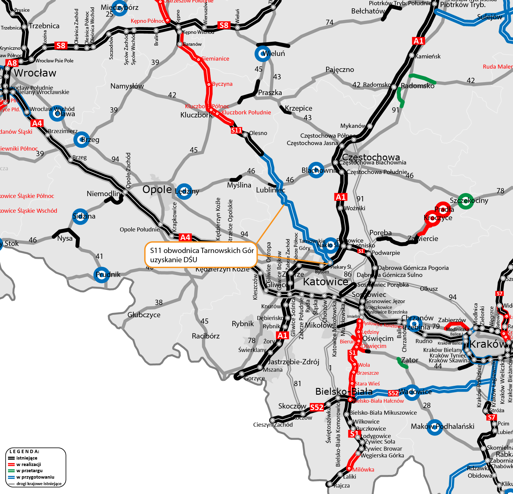 Regionalny Dyrektor Ochrony Środowiska w Katowicach wydał decyzję środowiskową (DŚU) dla drugiego, ponad 35-kilometrowego odcinka S11 w województwie śląskim stanowiącego obwodnicę Tarnowskich Gór. Równolegle trwa procedura administracyjna dla pierwszego odcinka od granicy woj. opolskiego i śląskiego do obwodnicy Tarnowskich Gór.