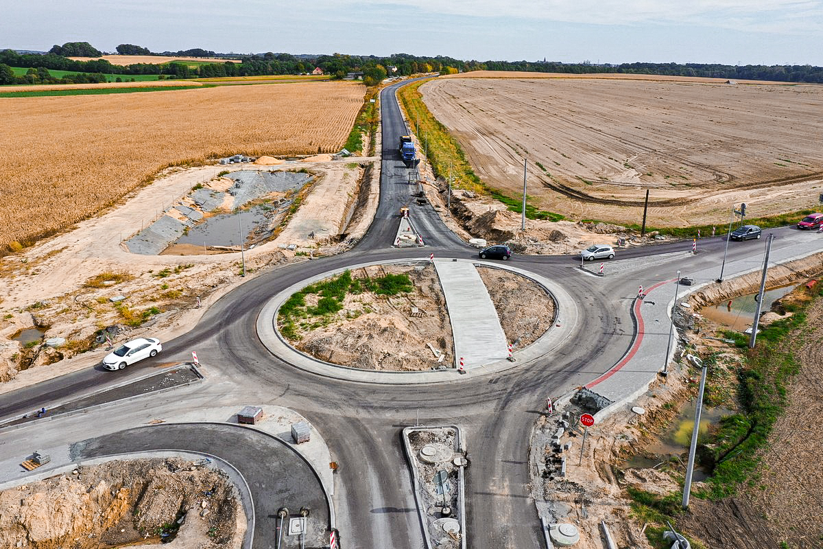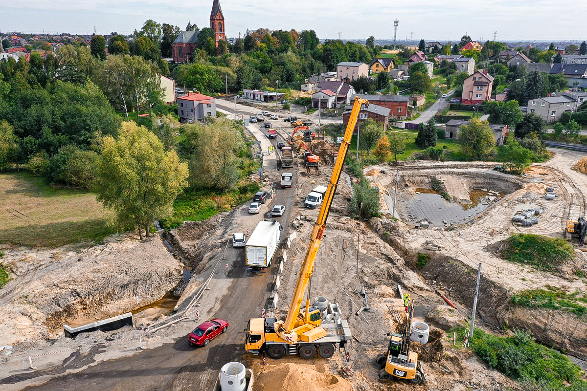 Na początkowym odcinku o długości o 1 km, zaczynającym się na wysokości parku w Pyskowicach a kończącym się za skrzyżowaniem z DW901, trwają prace przy budowie konstrukcji nawierzchni wraz z przebudową skrzyżowania drogi krajowej i wojewódzkiej. Na kolejnym odcinku, do Karchowic, wyszliśmy już z budową drogi do warstwy wiążącej konstrukcji asfaltowej drogi. Kontynuujemy budowę odwodnienia oraz kończymy prace brukarskie na ciągach pieszo-rowerowych. W Karchowicach, od sierpnia br. użytkownicy korzystają już z częściowo wybudowanego mostu nad potokiem Sroczka. Ruch pojazdów, z wykorzystaniem drogowej sygnalizacji świetlnej, poprowadziliśmy po części, na której wylano już asfalt twardolany. Tu również trwają prace brukarskie na ciągach pieszo-rowerowych i przy budowie zatok autobusowych. Podbudowa asfaltowa została już wykonana, z wyłączeniem odcinków, na których trwa przebudowa magistrali wodociągowej. Od Karchowic do ronda w Boniowicach wykonana jest warstwa wiążąca na całym docinku.
