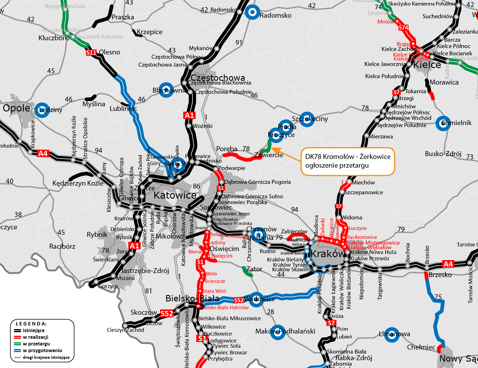 Ogłosiliśmy postępowanie przetargowe na budowę pozostałej części obwodnicy w ciągu DK78. Odcinek o długości 7,5 km stanowiący kontynuację budowanego od marca 2022 r. odcinka obwodnicy Poręby i Zawiercia swój początek będzie miał na budowanym węźle Kromołów. Zakończy się rondem w Żerkowicach, które zostanie wybudowane w ramach obwodnicy Kroczyc.