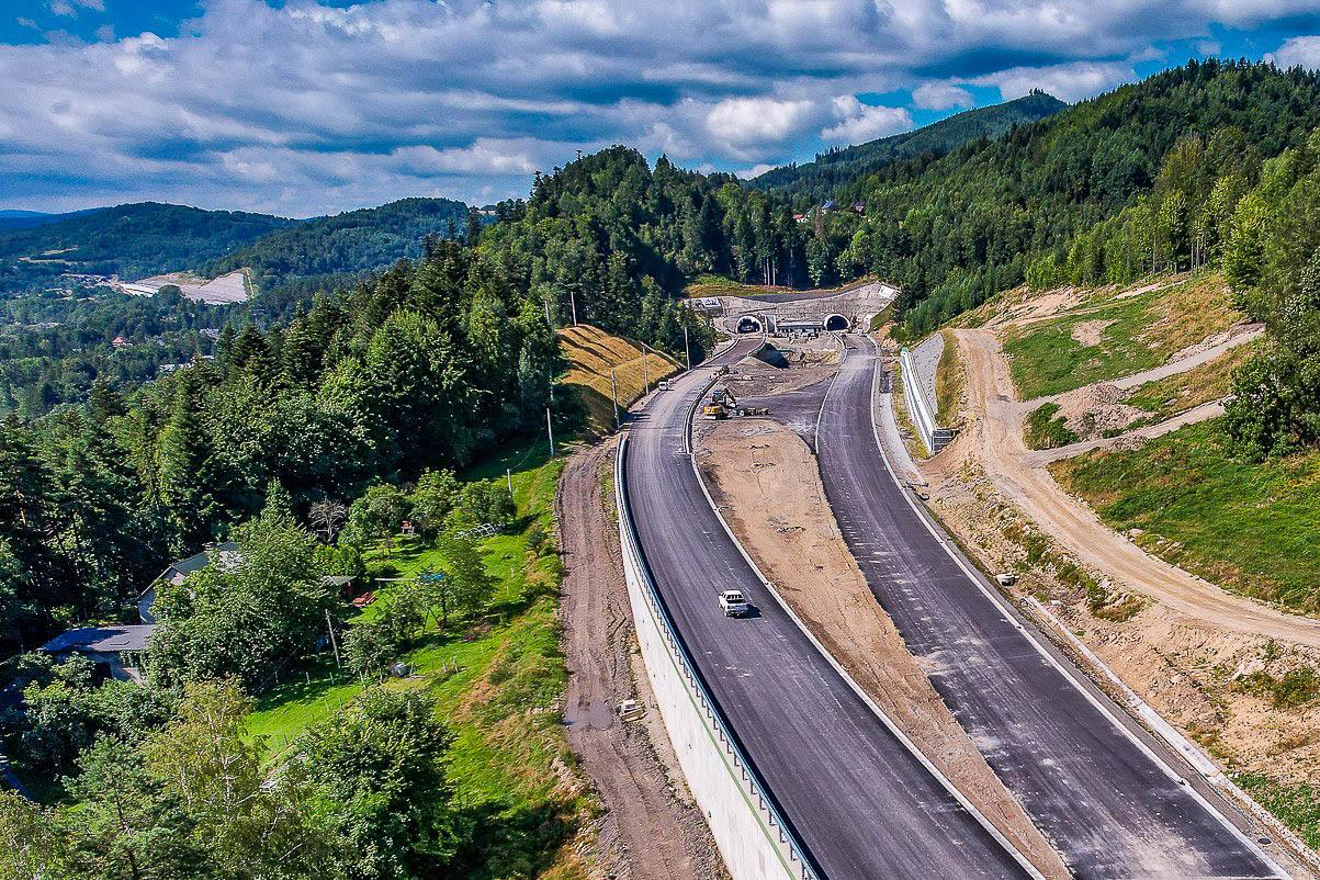 Na realizowanej inwestycji o długości 8,53 km drogowy odcinek trasy głównej ma 4,95 km długości, w tym droga dwujezdniowa – 2,30 km, a droga jednojezdniowa – 2,65 km. Do końca lipca udało się ułożyć na trasie głównej i łącznicach węzłów Przybędza i Milówka 74 proc. podbudowy bitumicznej, ponad 60 proc warstwy wiążącej. Rozpoczęliśmy także układanie warstwy ścieranej SMA, po której będą poruszały się pojazdy kołowe. Całość prac asfaltowych, za wyjątkiem krótkich odcinków portalowych powinna zostać zrealizowana do końca września br.