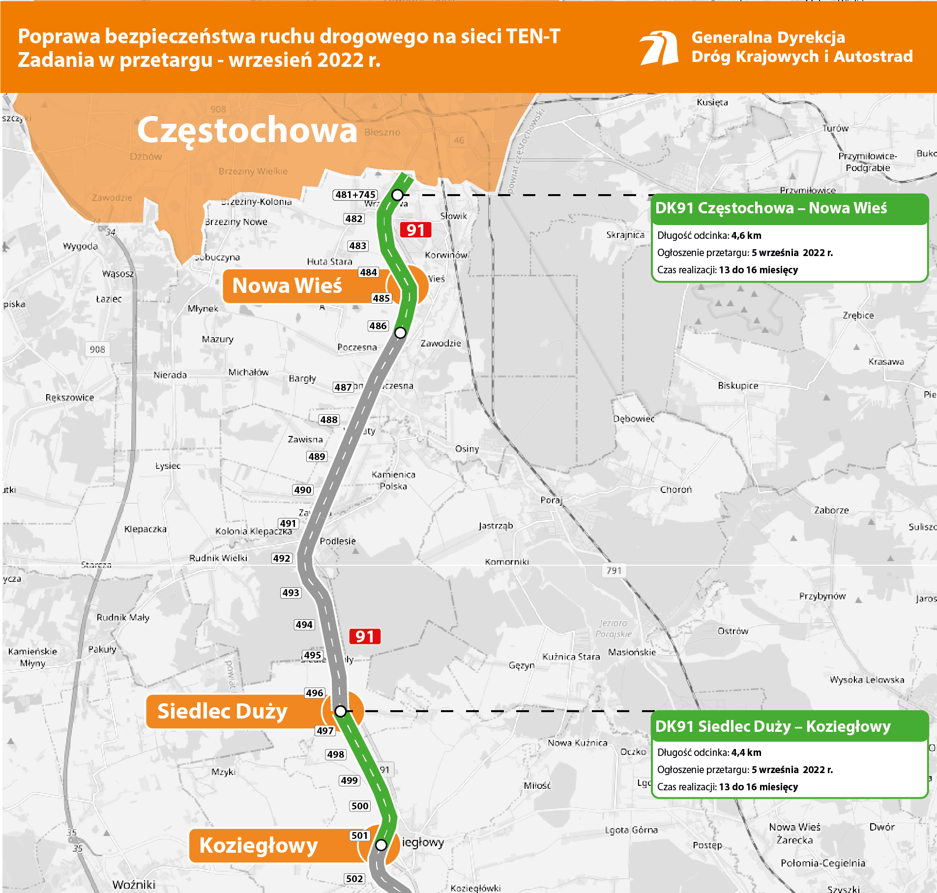 Ogłosiliśmy przetargi na przebudowę drogi krajowej nr 91 Częstochowa - Nowa Wieś oraz Siedlec Duży - Koziegłowy. Inwestycja wpłynie na poprawę bezpieczeństwa ruchu drogowego i warunki komunikacyjne.
