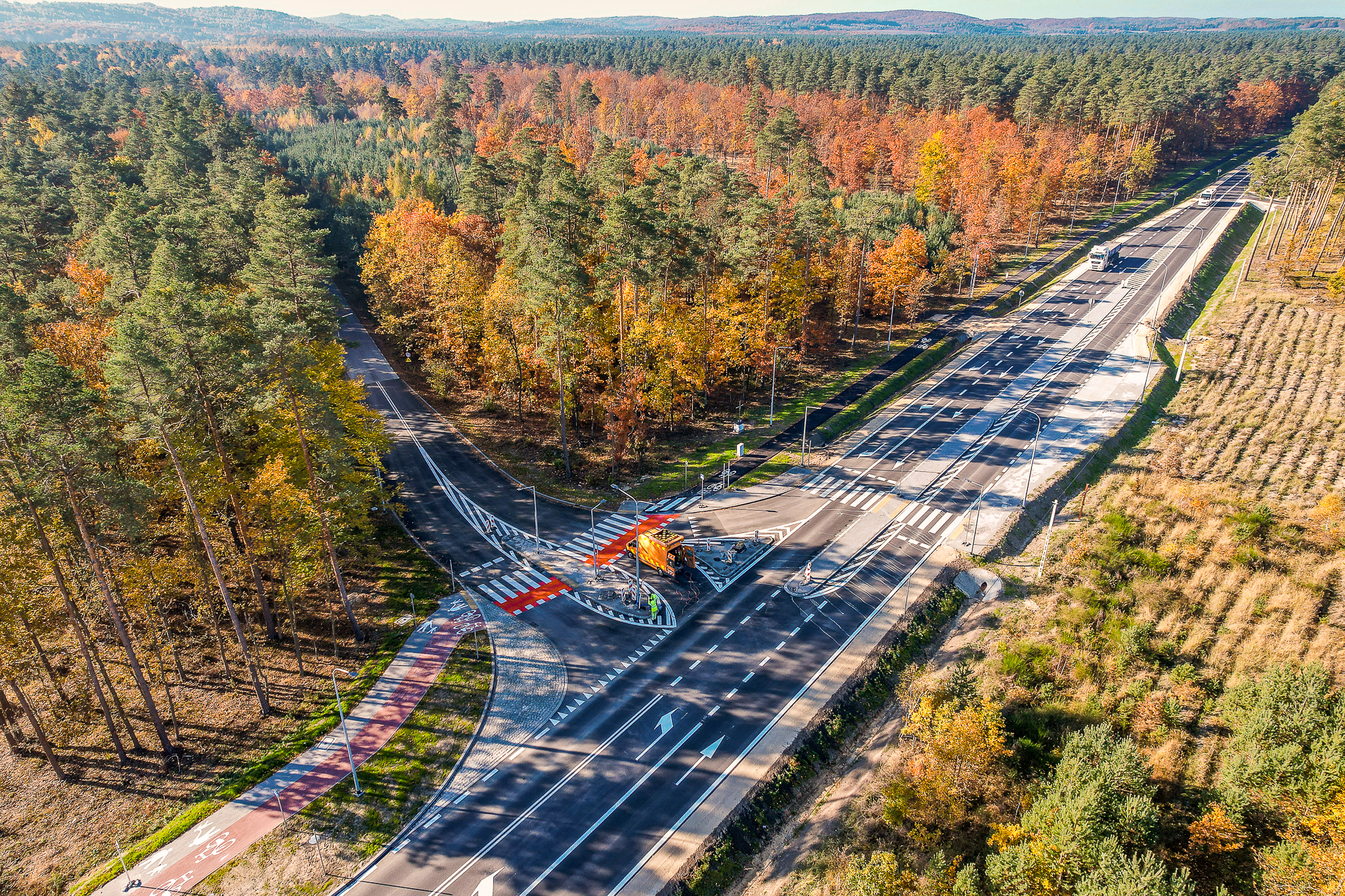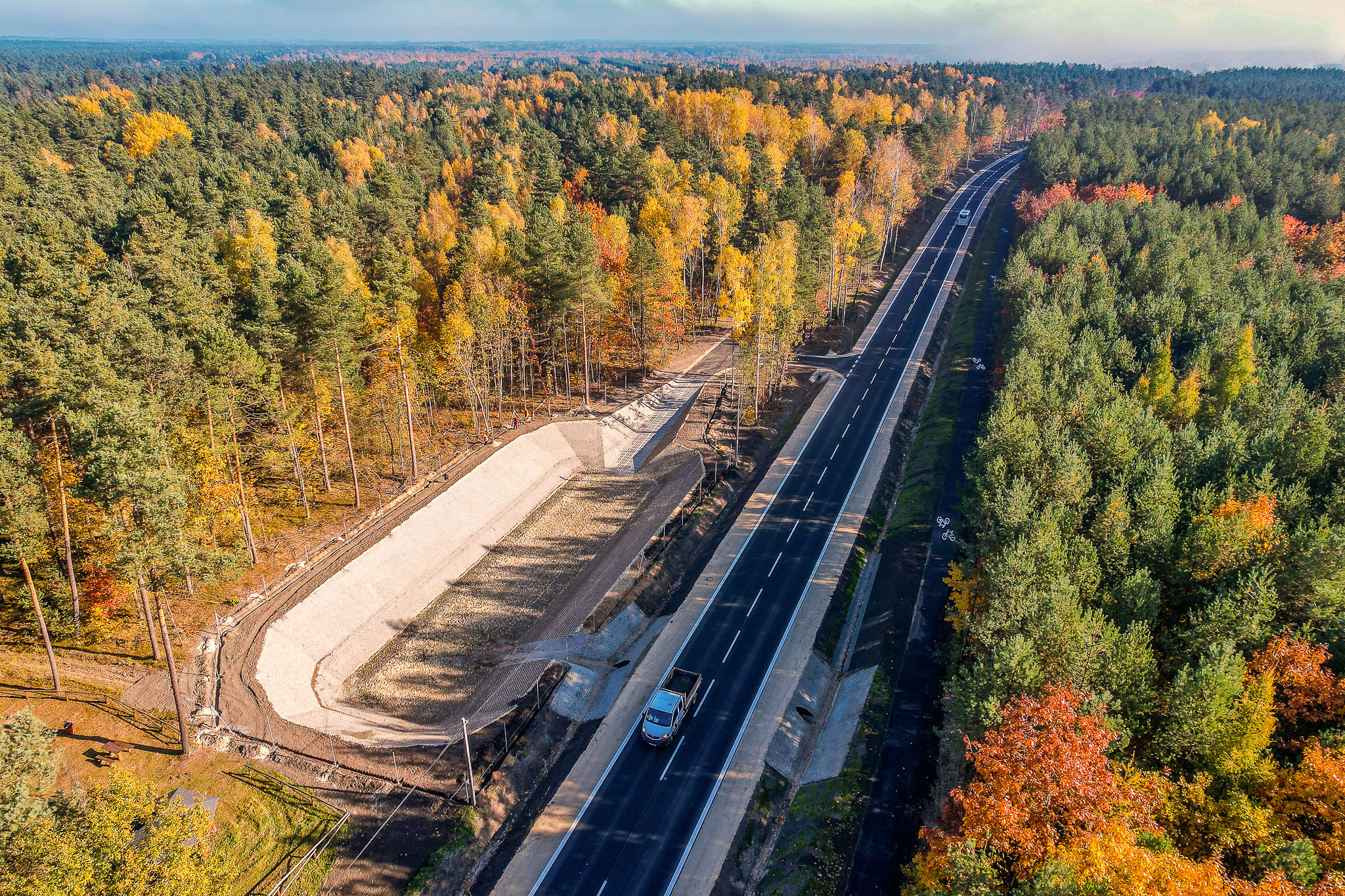 Zaawansowanie robót na tym odcinku również doszło do 90 proc. Obecnie na trasie głównej rozpoczęto układanie dwóch rodzajów warstwy ścieralnych. Tu również, aby obniżyć hałas emitowany przez koła poruszających się pojazdów, na terenach zabudowanych ułożona zostanie nawierzchnia o obniżonej hałaśliwości z mastyksu grysowego. Do zakończenia kontraktu pozostało jeszcze wykonanie całego zakresu robót asfaltowych, dokończenie budowy przepustów, zjazdów oraz robót brukarskich. Konieczne jest też odmulenie zbiornika, rowu przy drodze powiatowej i osadzenie wylotów kanałów. Przed zgłoszeniem odbioru robót konieczne będzie też zakończenie prac wykończeniowych, umacniania skarp, humusowania i obsiania trenów zielonych, montażu urządzeń bezpieczeństwa ruchu drogowego oraz oznakowania poziomego i pionowego.