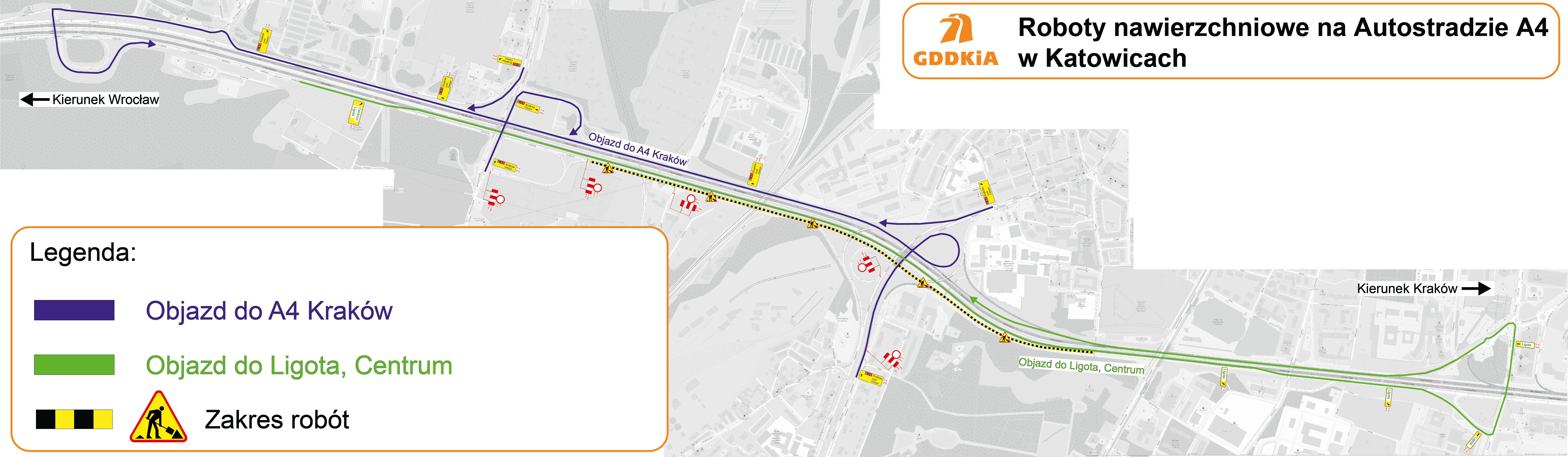 Relacje z Katowic Centrum, Katowic Ligota oraz z ulicy Bocheńskiego w kierunku Krakowa zostaną skierowane na objazd prowadzący ulicą Kochłowicką. Kierowcy będą mogli zawrócić w obszarze węzła znajdującego się w rejonie osiedla Witosa w Katowicach. Natomiast relacje z Wrocławia w kierunku Katowice Centrum oraz Katowice Ligota zostaną przekierowane autostradą A4 na węzeł z ulicą Francuską w Katowicach. Dodatkowo zostanie całkowicie zamknięty wlot ulicy Przekopowej na autostradę A4, a ruch pojazdów w kierunku Krakowa zostanie skierowany na węzeł z ulicą Bocheńskiego i dalej wyznaczonym objazdem ulicą Kochłowicką.