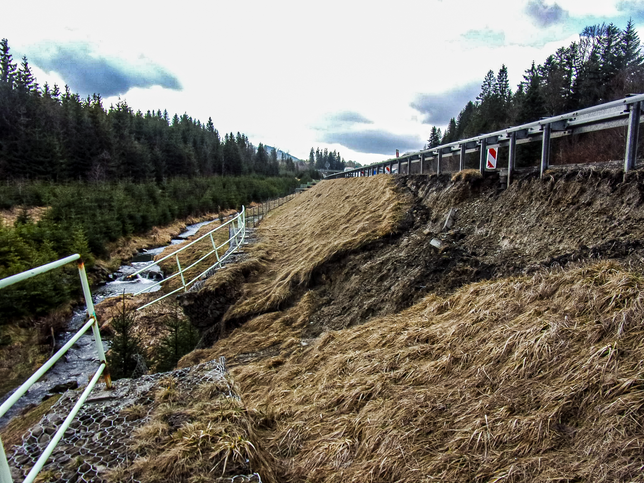 Niekorzystne warunki pogodowe z początku lutego br., w postaci opadów deszczu oraz dodatniej temperatury sprzyjającej intensywnym roztopom, spowodowały nasiąkniecie gruntu i korpusu drogowego. W efekcie doprowadziły do utraty ich stateczności i osunięcia muru oporowego z koszy siatkowo-kamiennych oraz krawędzi jezdni. Doraźnie, do czasu wyłonienia wykonawcy robót, zabezpieczono miejsce obrywu przed dalszym namakaniem. Dodatkowo, w trybie awaryjnym, wprowadzono na tym odcinku drogi ekspresowej ruch wahadłowy sterowany sygnalizacją świetlną. Pozwoliło to odciążyć jezdnię i maksymalnie odsunąć tor jazdy od uszkodzonej krawędzi jezdni. Taka organizacja ruchu będzie obowiązywała do czasu wybudowania bypassu pomiędzy S1 a odcinkiem równoległej drogi gminnej.