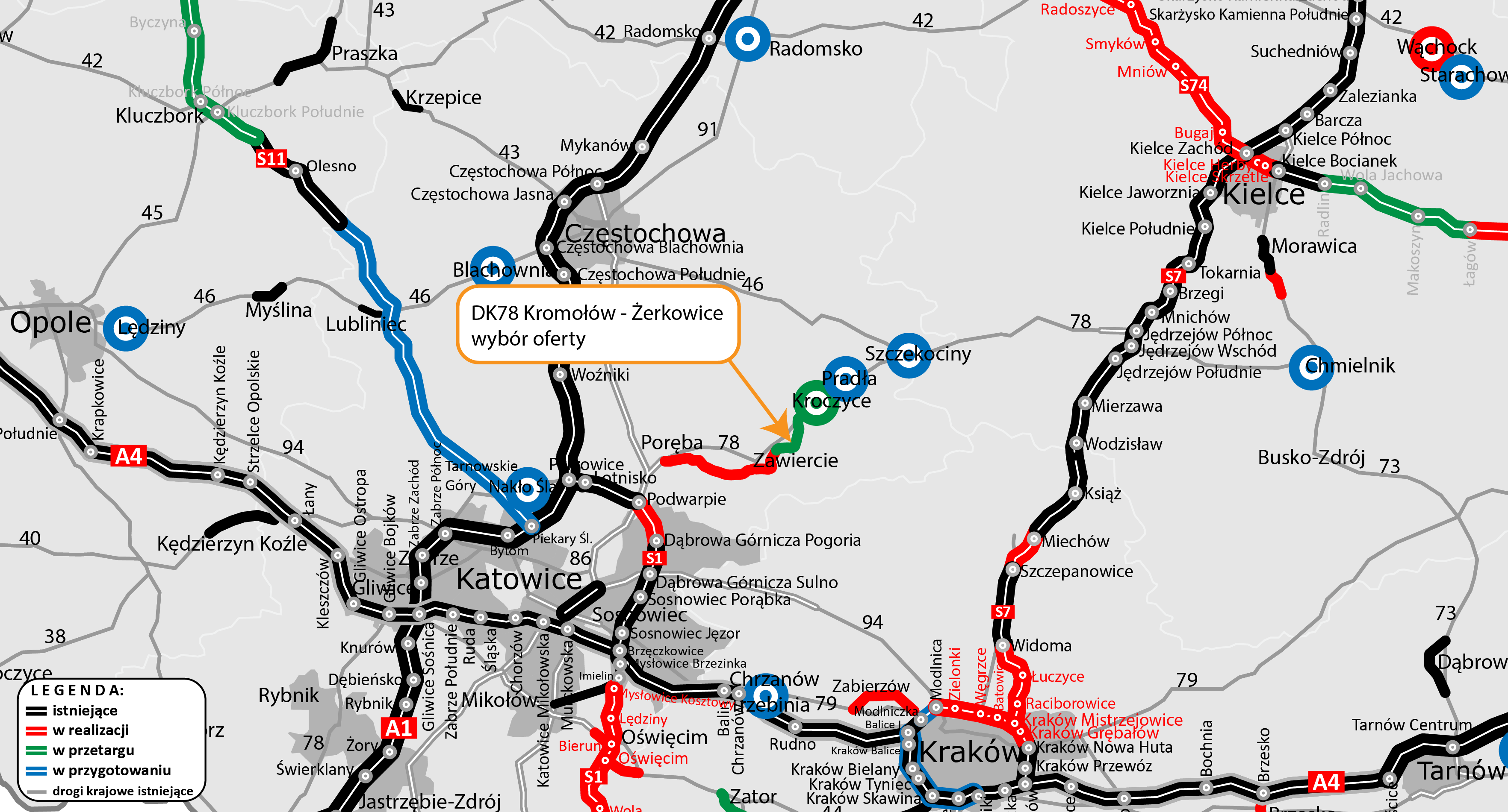 DK78 w województwie śląskim liczy ponad 166 km, z czego w administracji katowickiego oddziału GDDKiA znajduje się ponad 134 km. Jej wschodni odcinek, od Mierzęcic do granicy województw w Goleniowach, ma ponad 75 km długości. Na tym odcinku przygotowujemy do realizacji kolejne trzy obwodnice: Kroczyc, Pradeł, Szczekocin i Goleniów oraz prawie 6-kilometrowy odcinek Pradła - Irządze, zlokalizowany pomiędzy dwiema ostatnimi obwodnicami. Szacunkowa łączna długość tych trzech obwodnic to 24,5 km, z czego 9,1 km to długość obwodnicy Kroczyc, 2,3 km obwodnicy Pradeł, a 13,1 km Szczekocin i Goleniów. Prace przygotowawcze dla obwodnic rozpoczęły się już wiele lat temu, w związku z czym są one już częściowo przygotowane do realizacji i posiadają decyzje o środowiskowych uwarunkowaniach.