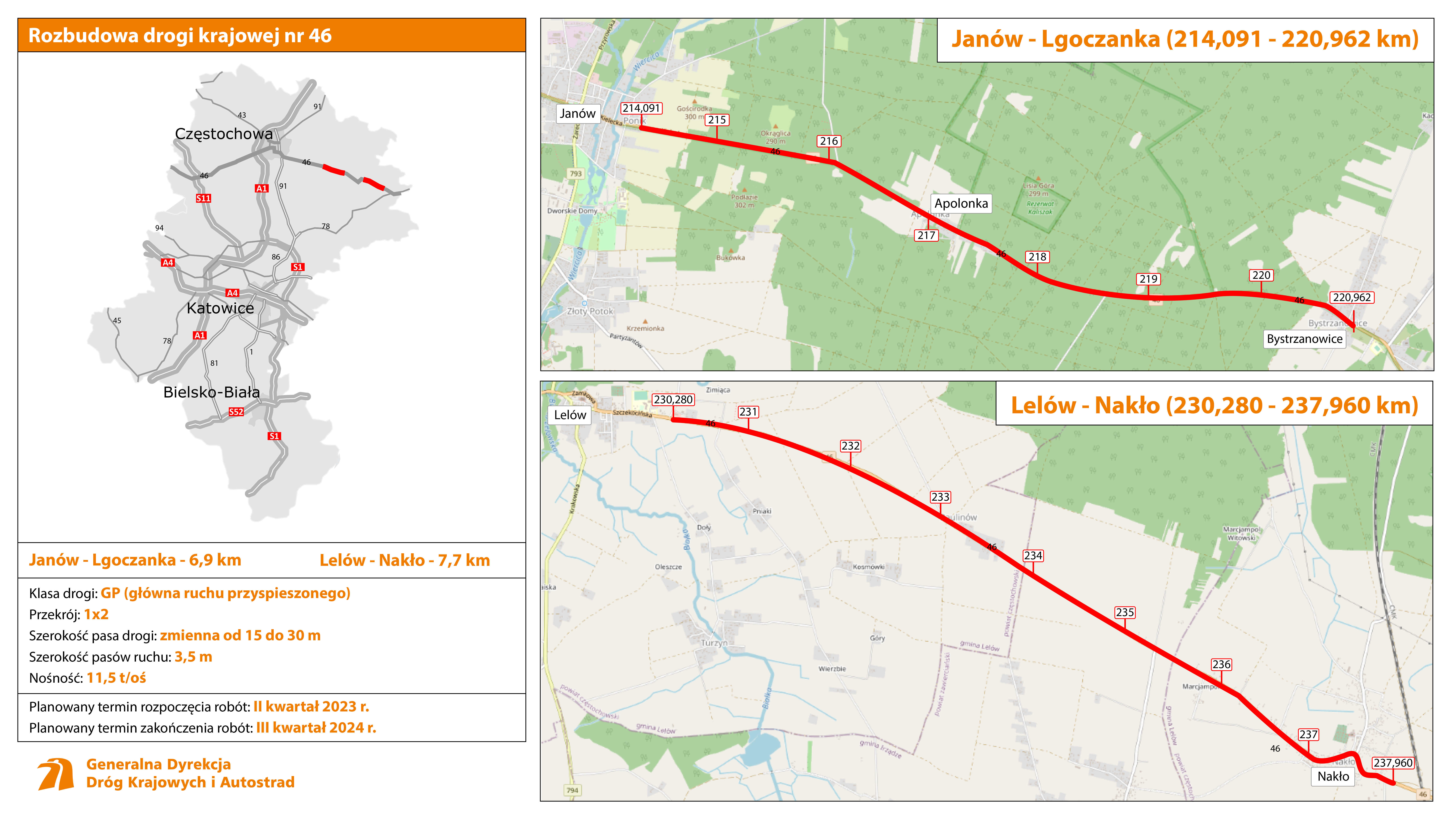W obu przetargach najkorzystniejsze oferty złożyła firma Adac-Lewar. Rozbudowę trasy pomiędzy Lelowem i Nakłem wyceniła na prawie 51 mln zł, a odcinka Janów - Lgoczanka na ponad 53 mln zł. Jeśli nie wpłyną odwołania od wyboru ofert, do podpisania umów mogłoby dojść w czerwcu br. Tym samym w realizacji znalazłoby się prawie 15 km DK46.