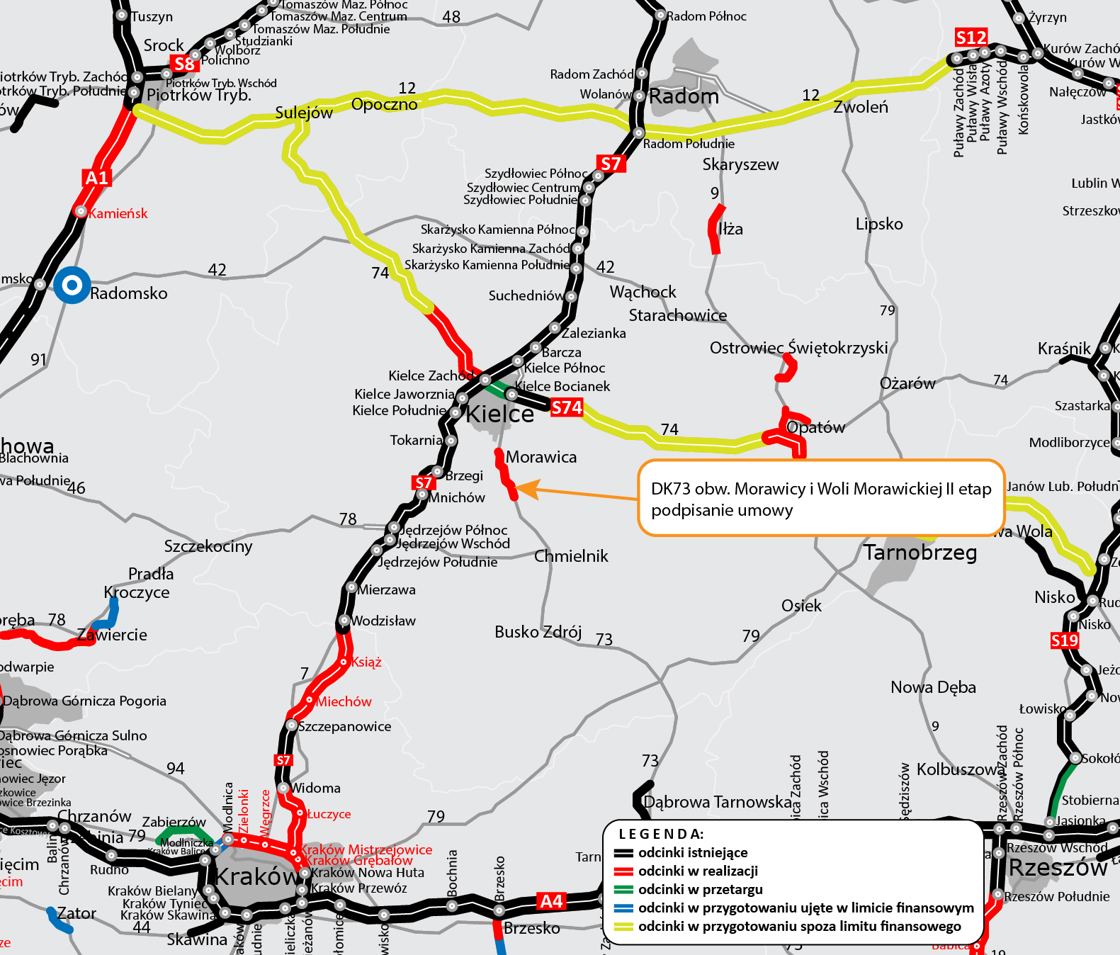 W ramach inwestycji realizowanej w systemie Projektuj i buduj powstanie odcinek DK73 o długości ok. 4,4 km, biegnący nowym śladem i stanowiący drugi fragment obwodnicy Morawicy i Woli Morawickiej. Obie inwestycje realizowane są w ramach rządowego Programu Budowy Dróg Krajowych.