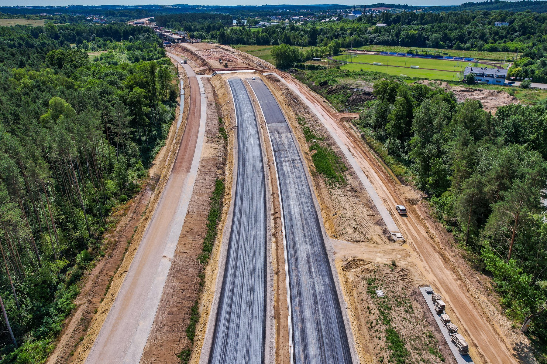 Równocześnie z robotami ziemnymi, pracami przy nasypach i wykopach, wykonywane są pierwsze odcinki podbudowy bitumicznej pod kolejne warstwy nawierzchni. Stanowią one ¼ długości trasy zasadniczej. Ułożone zostały także odcinki próbne warstwy wiążącej. Widoczny jest nie tylko ślad przyszłej obwodnicy Morawicy i Woli Morawickiej, ale także dwóch rond – na początku i na końcu odcinka.