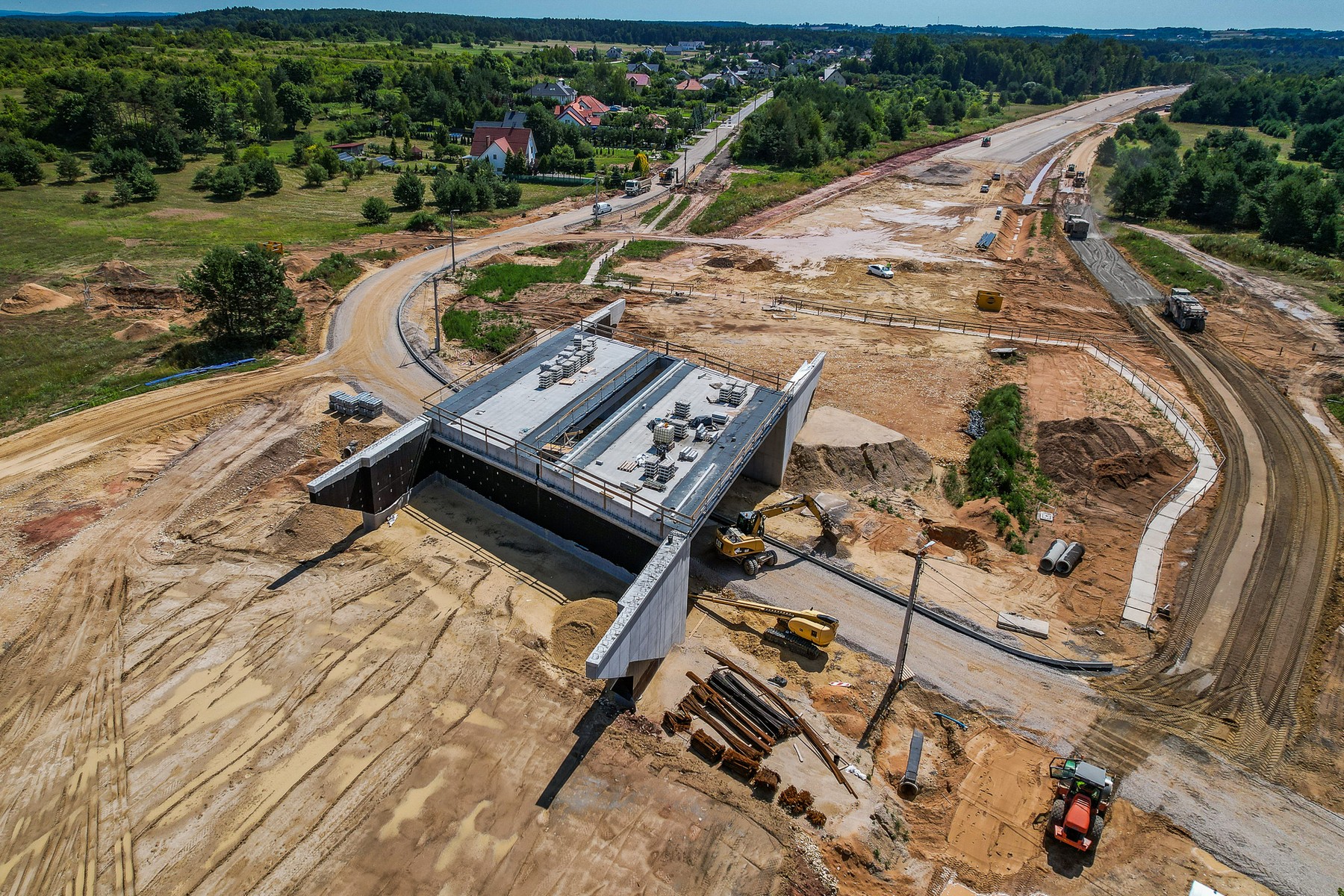 Gotowe są konstrukcje nośne pięciu obiektów mostowych, czyli podziemnego przejścia dla pieszych na początkowym odcinku inwestycji, trzech mostów nad ciekiem w Łabędziowie (w ciągu trasy głównej i dwóch dróg dojazdowych) oraz wiaduktu nad drogą powiatową.