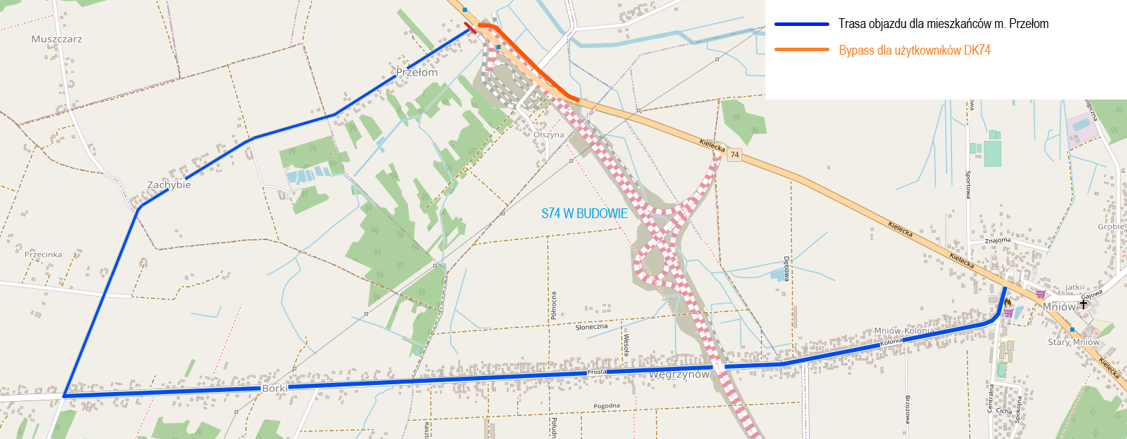 Trasa S74 będzie biegła w śladzie istniejącej drogi krajowej nr 74 jedynie na początkowym odcinku, w miejscowości Przełom, przed węzłem Mniów. Dlatego konieczne będzie zamknięcie w tym miejscu fragmentu istniejącej trasy o długości około 500 m. Ruch przekierowany zostanie na specjalnie wybudowany bajpas, który po zakończeniu inwestycji stanowić będzie nowy przebieg powiatowej.