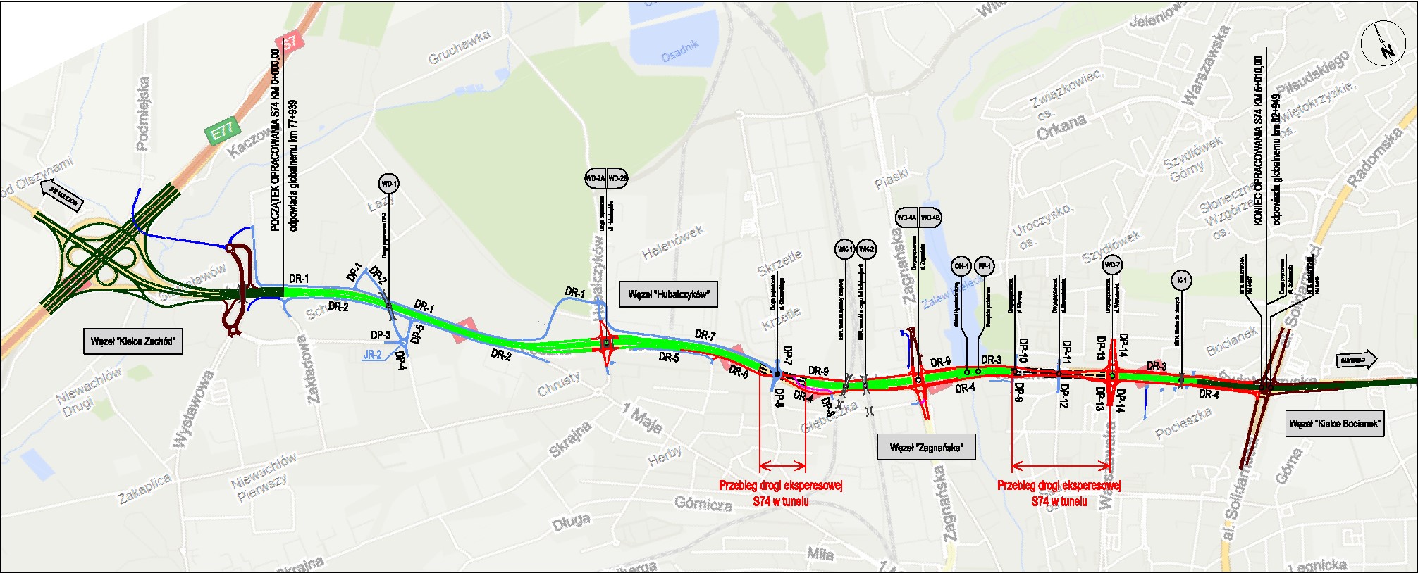 W ramach inwestycji planowana jest budowa dwóch węzłów drogowych (Hubalczyków, Zagnańska) i dwóch tuneli. Dłuższy z nich, około półkilometrowy, planowany jest na odcinku sąsiadującym z zabudową osiedlową między ulicami Klonową a Warszawską. To odpowiedź na postulaty mieszkańców miasta. Planowana jest również m.in. budowa wiaduktu nad S74 w ciągu ulicy Transportowców, ronda nad tunelem pod ulicą Olszewskiego, a także wiaduktu w ciągu DK73 w obrębie węzła Bocianek. Wzdłuż nowego odcinka przewidziano ciąg rowerowy.