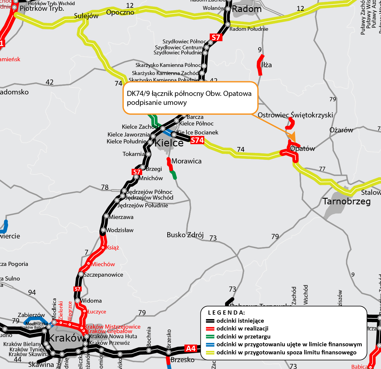 Zgodnie z umową, łącznik północny do obwodnicy zrealizuje firma Mostostal Warszawa za kwotę ok. 57,5 mln zł. Prace zostaną zrealizowane w ciągu 33 miesięcy, z wyłączeniem okresów zimowych w czasie robót budowlanych. Łącznikiem w ciągu drogi krajowej nr 74, a także dużą obwodnicą Opatowa w ciągu S74 i DK9, pojedziemy w 2025 roku. Obie inwestycje realizowane są w systemie Projektuj i buduj w ramach rządowego Programu Budowy Dróg Krajowych.