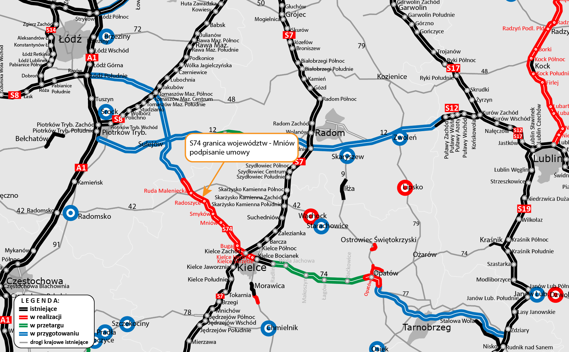 Wyłoniliśmy najkorzystniejszą ofertę w przetargu na realizację S74 Łagów – Opatów (ok. 18 km). Trwa kontrola uprzednia postępowania prowadzona przez Prezesa Urzędu Zamówień Publicznych. W najbliższym czasie wyłonimy ofertę w przetargu na realizację S74 od Cedzyny do Łagowa (ok. 30 km).