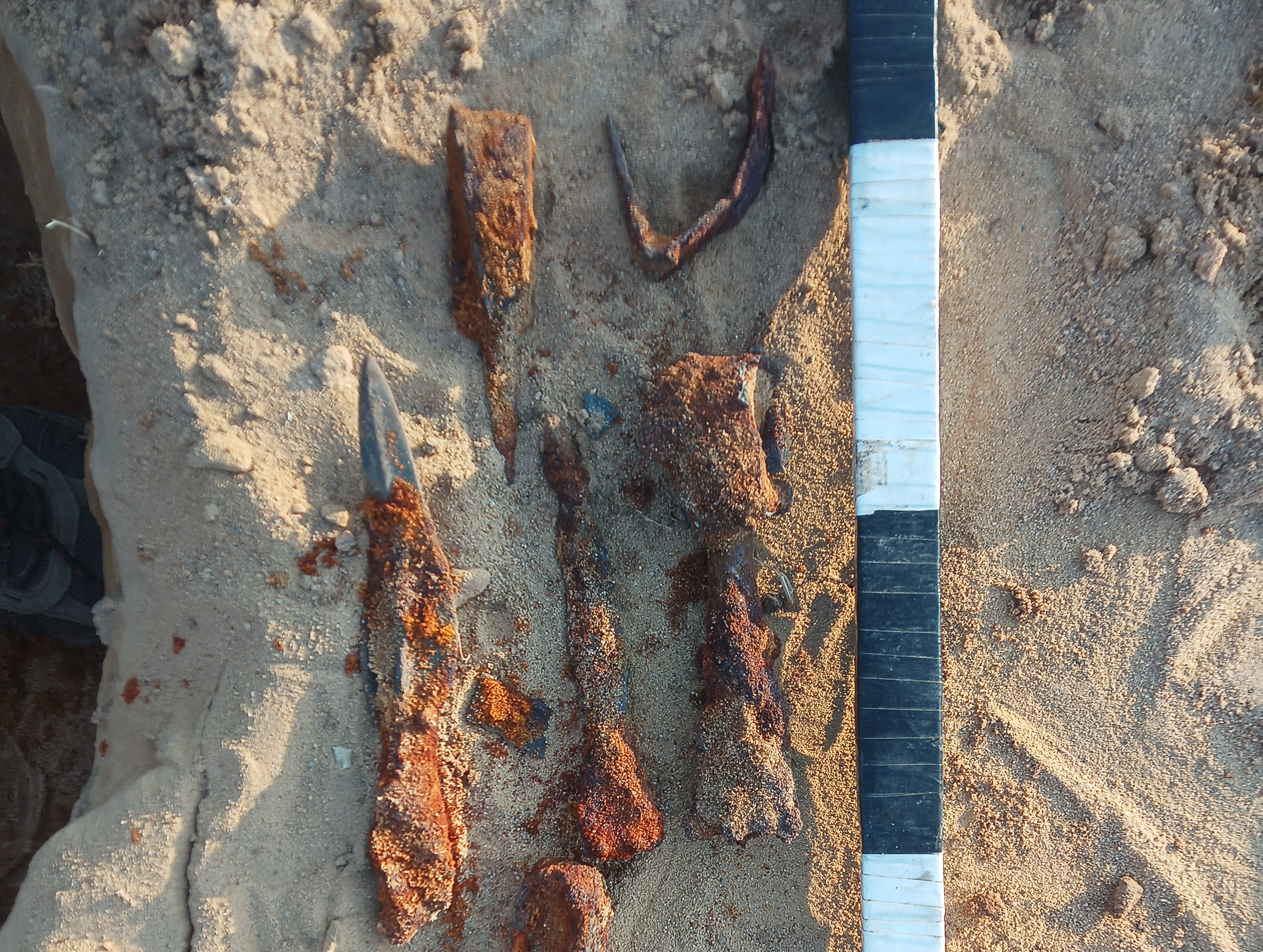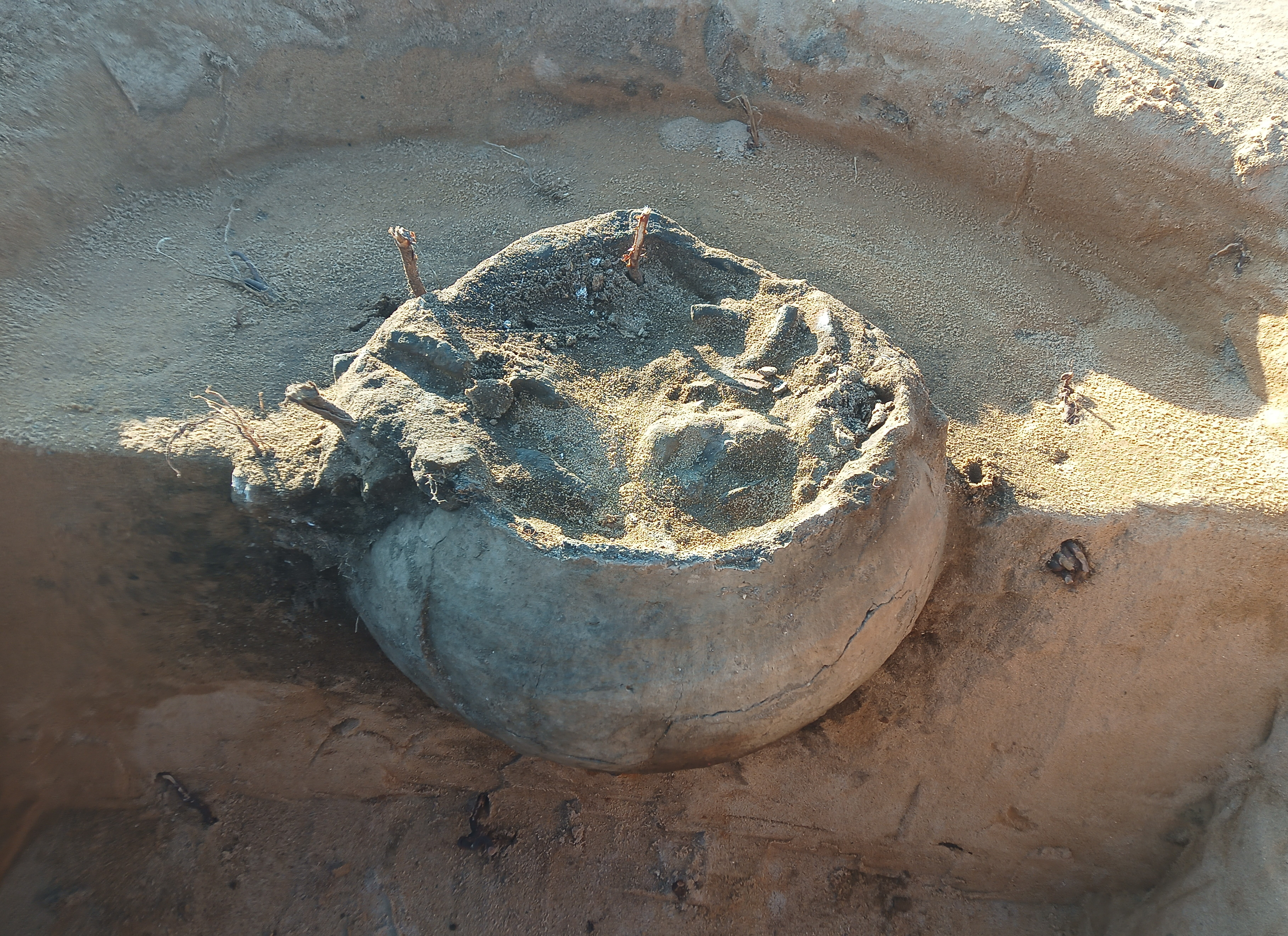 Prawdziwą gratką okazała się jednak jedyna zachowana w całości popielnica, najprawdopodobniej z okresu wpływów rzymskich kultury przeworskiej z II wieku naszej ery. Na ten okres datowane są m.in. pochówki ciałopalne popielnicowe. Zakopana w ziemi duża gliniana urna o kilkudziesięciocentymetrowej wysokości ułożona była na czterech skrzyżowanych grotach oszczepów, dwa z nich były rytualnie zagięte. Dlaczego groty były cztery, skoro najczęściej przy popielnicach odkrywano dwa? Dlaczego tylko dwa z nich były rytualnie zagięte? Czy mamy do czynienia z pochówkiem podwójnym, a może pojedynczym, ale wyjątkowo znamienitej osoby? W odpowiedzi na te pytania może pomóc specjalistyczne badanie zawartości urny. Jej wydobycie i transport możliwe były tylko z zawartością, w celu zapobieżenia zniszczenia. W kulturze przeworskiej zmarłych chowano z wyposażeniem – np. mężczyzn z bronią, narzędziami, kobiety z biżuterią, zapinkami, przęślikami. Rozgrzane w ogniu groty oszczepów czy noże rytualnie zaginano.