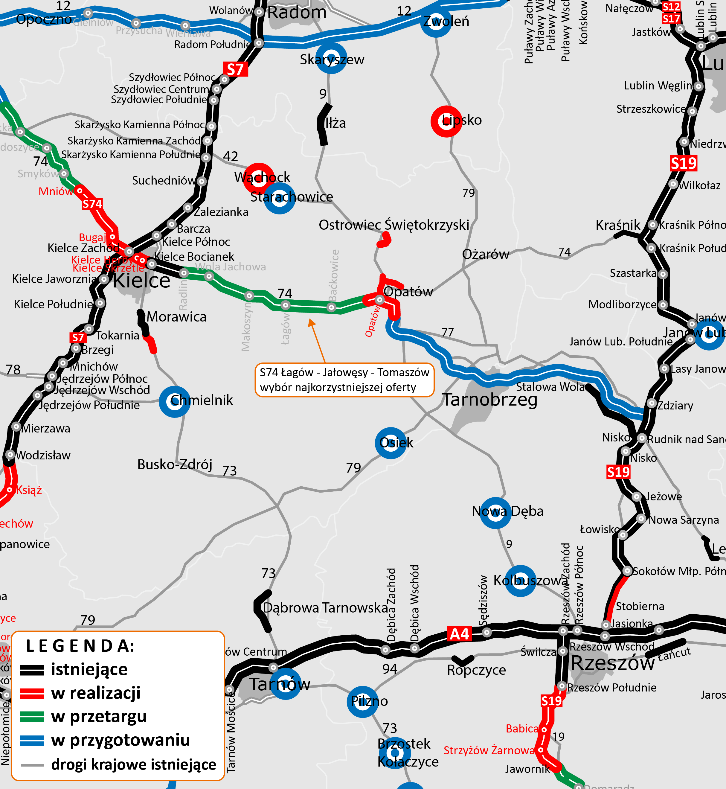 Wyłoniliśmy najkorzystniejszą ofertę w przetargu na zaprojektowanie i budowę drogi ekspresowej S74 dla odcinka Łagów - Jałowęsy - Tomaszów. Przy braku odwołań od rozstrzygnięcia i po zakończeniu kontroli uprzedniej przez Prezesa Urzędu Zamówień Publicznych, planujemy podpisać umowę z wykonawcą w IV kwartale br.