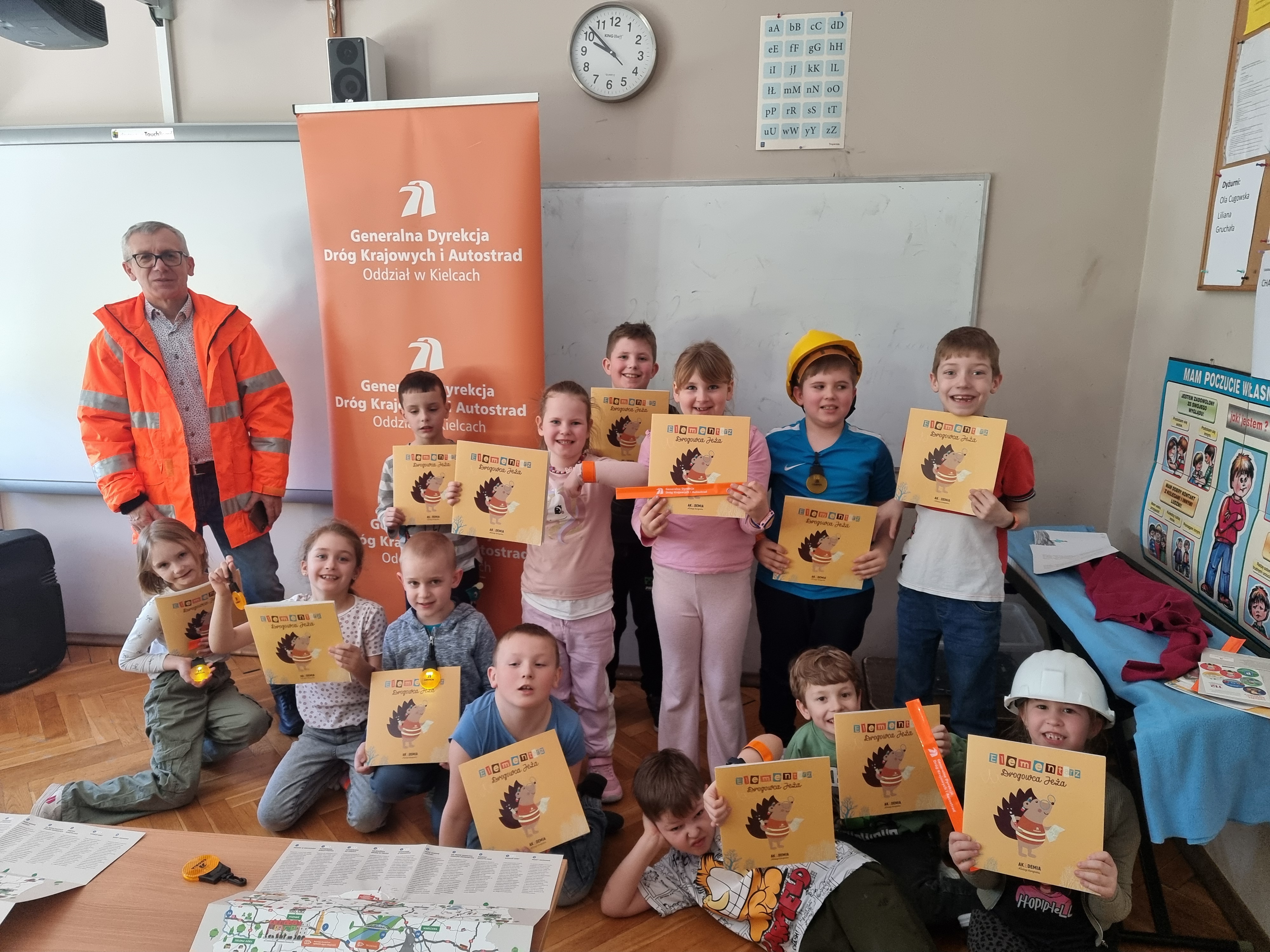 W ramach cyklicznej akcji "Pierwszaki - zdrowo i bezpiecznie do szkoły" przeprowdziliśmy edukacyjne lekcje dla uczniów klas pierwszych w kolejnych szkołach na terenie województwa świętokrzyskiego. Dzieci poznały tajniki budowy dróg, maszyny drogowe i naszą pracę. Przypomnieliśmy o podstawowych zasadach bezpiecznego poruszania się po drogach. Najmłodsi chętnie uczyli się bezpiecznych zachowań od Drogowca Jeża - znanego już bohatera filmów edukacyjnych GDDKiA. To kolejne spotkanie edukacyjne z najmłodszymi użytkownikami dróg. Od początku roku odwiedziliśmy siedem placówek oświatowych w województwie świętokrzyskim, aby przypomnieć pierwszoklasistom o bezpieczeństwie. Od kilkunastu lat drogowcy z kieleckiego Oddziału Generalnej Dyrekcji Dróg Krajowych i Autostrad włączają się do edukacyjnej akcji "Pierwszaki - zdrowo i bezpiecznie do szkoły" organizowanej co roku przez dziennikarzy "Echa Dnia" przy współpracy w policjantami ruchu drogowego. W marcu i kwietniu odwiedziliśmy z Elementarzem Drogowca Jeża i elementami odblaskowymi pierwszoklasistów z Kołaczkowic w powiecie buskim, z Opatowca w powiecie kazimierskim, z Suchedniowa w powiecie Skarżyskim i z Sandomierza.