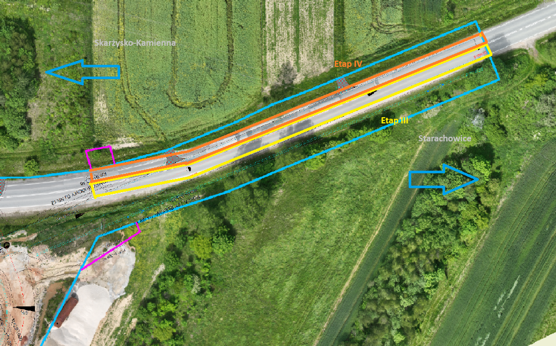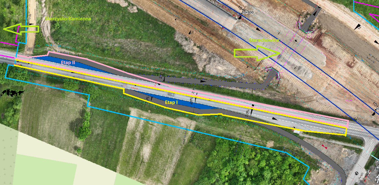 W związku z planowanymi robotami, na istniejącej DK42 wprowadzane będą zmiany w organizacji ruchu w czterech kolejnych etapach. W każdym etapie obowiązywać będzie ruch wahadłowy sterowany sygnalizacją świetlną. Zmieniać się będą lokalizacje odcinków z ruchem wahadłowym i strony drogi wyłączone z ruchu. Dlatego apelujemy i prosimy o zwracanie szczególnej uwagi na zmieniające się również tymczasowe oznakowanie. Budowa nowych połączeń w obrębie skrzyżowania planowana jest do połowy września. Po zakończeniu tych robót, ruch po DK42 odbywać się będzie w obu kierunkach, ale poprowadzony już będzie jej nowym przebiegiem przez skrzyżowanie. Podobne prace planowane są we wrześniu na końcowym odcinku inwestycji, czyli na granicy Starachowic, na włączeniu budowanej obwodnicy do obecnej DK42.