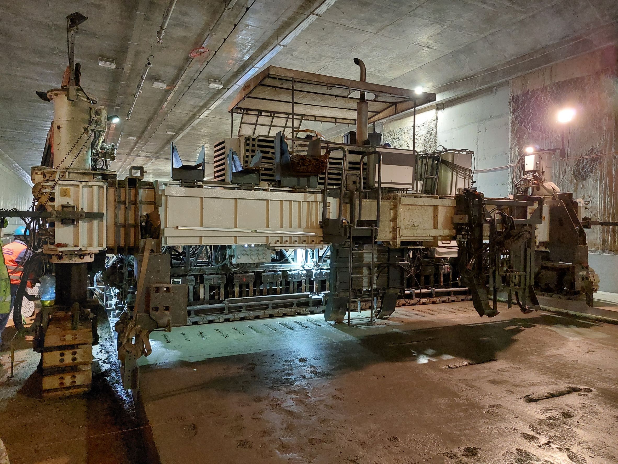 Nawierzchnia betonowa w tunelu w Dziekanowicach układana jest na specjalnie przygotowanej podbudowie z kruszywa. To kluczowe zadanie wykonują specjalne maszyny, tzw. układarki. Prędkość, z jaką układają nawierzchnię, waha się od 24 do 42 metrów…. na godzinę. Dla porównania, rozściełacze rozkładające najbardziej rozpowszechnioną na drogach nawierzchnię asfaltową (zwaną popularnie asfaltem) poruszają się ponad dziesięciokrotnie szybciej. Z kolei średnia prędkość pieszego to 4,5 km/h, a to już ponad 100 razy więcej od układarki.