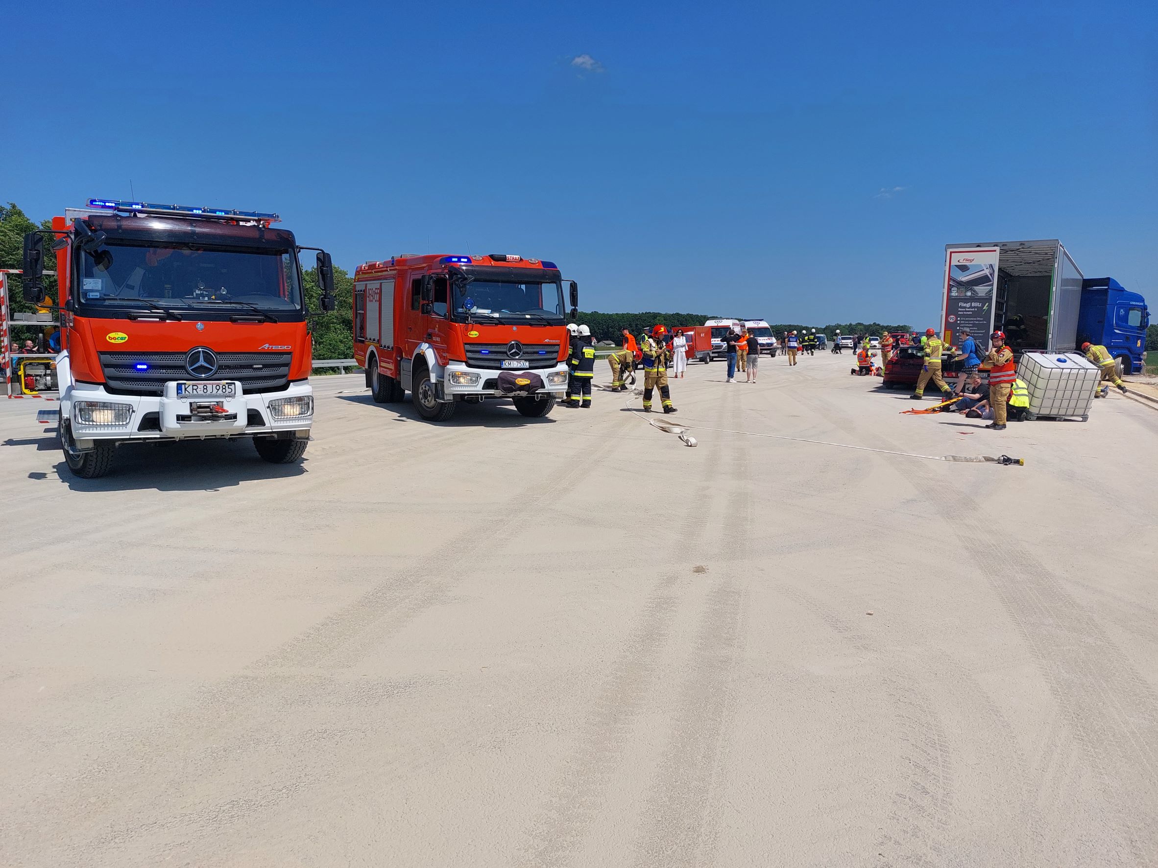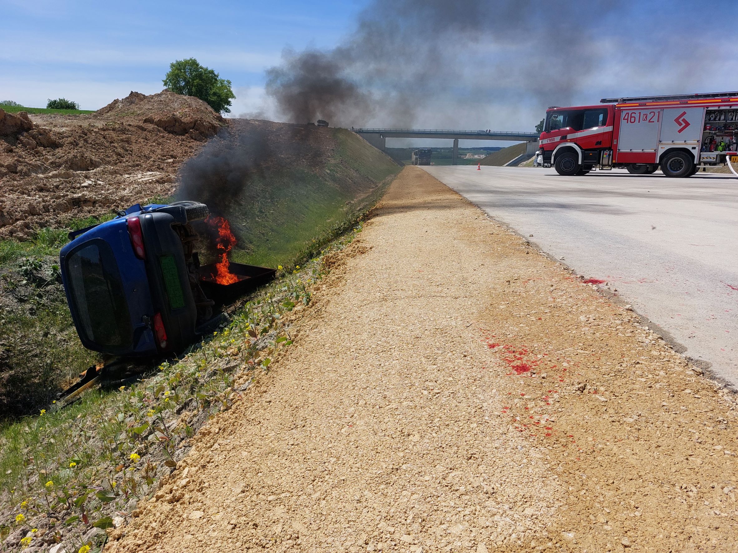 Straż pożarna przeprowadziła ćwiczenia na budowanym odcinku drogi ekspresowej S7 Moczydło - Miechów. W ćwiczeniach brały udział jednostki Komendy Powiatowej Państwowej Straży Pożarnej w Miechowie, Ochotniczych Straży Pożarnych, Policji i pogotowia ratunkowego.