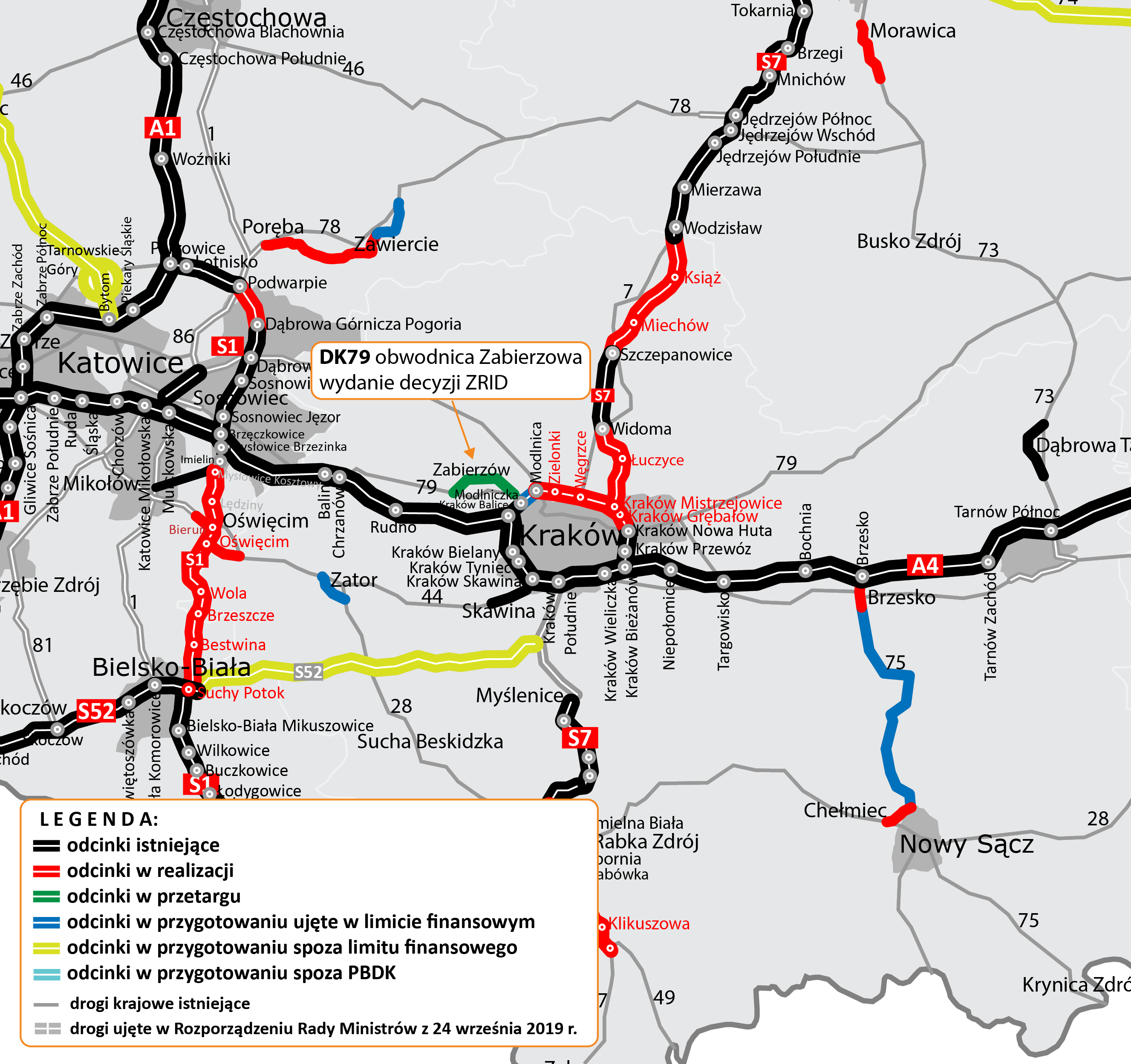 Wojewoda Małopolski wydał decyzję o zezwoleniu na realizację inwestycji drogowej (ZRID) dla obwodnicy Zabierzowa w ciągu DK79. Aktualnie trwa postępowanie przetargowe na wyłonienie wykonawcy tej inwestycji.
