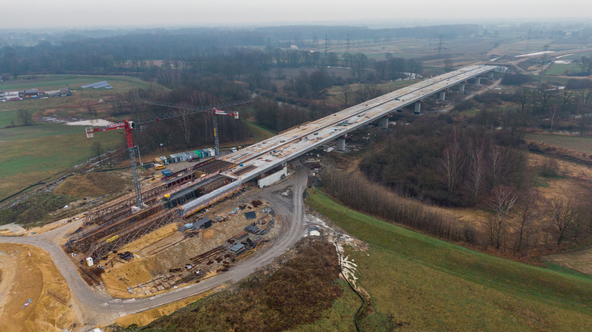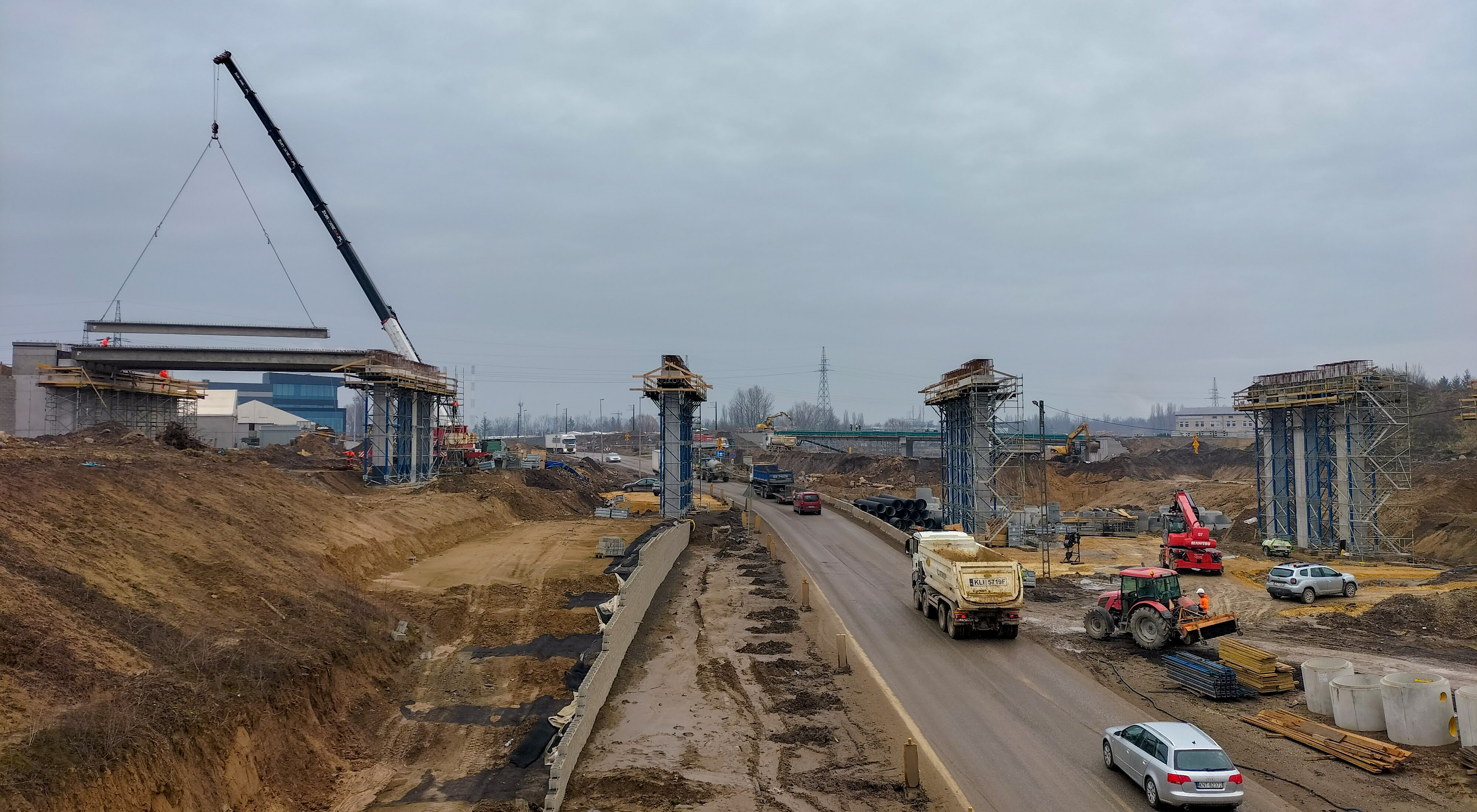 Tej zimy na terenie budowy prowadziliśmy prace ziemne w zakresie przygotowania drenażu w pasie między jezdniami i rowów odwadniających. Wzmacnialiśmy stożki przy wiaduktach, betonowaliśmy płytę wiaduktu, montowaliśmy bariery energochłonne na wiaduktach i oświetlenie na estakadzie w Lasku.