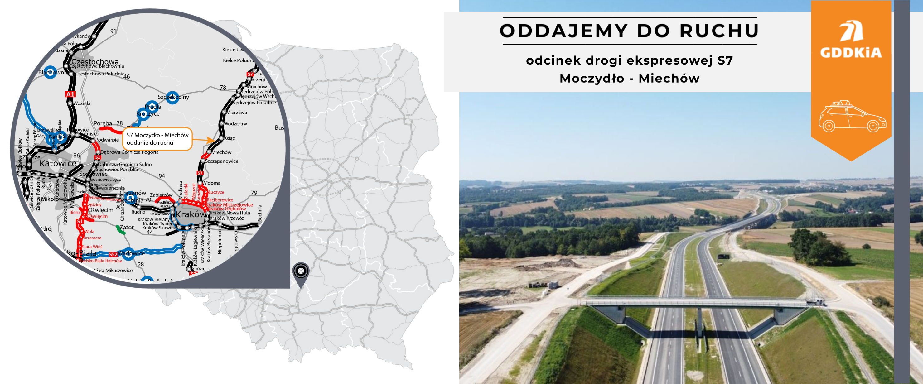 Mieszkańcy Miechowa mogą od dziś w około dwie i pół godziny dojechać trasą S7 bezpośrednio do Warszawy. Mieszkańcy Krakowa na taką możliwość muszą jeszcze poczekać. Dzięki oddaniu odcinka Moczydło - Miechów łączna długość odcinków drogi ekspresowej na północ od Krakowa wzrosła ponad dwukrotnie, do 31,8 km. Drugi funkcjonujący fragment tej trasy to otwarty w październiku 2021 roku 13-kilometrowy odcinek między węzłami Szczepanowice i Widoma.