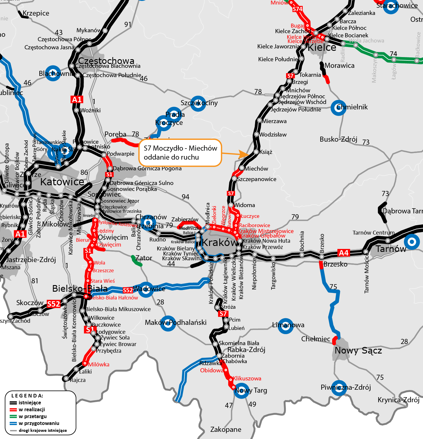- 5,3 km między węzłami Miechów i Szczepanowice - planowane otwarcie sierpień 2024. Do czasu oddania tego odcinka na węźle w Miechowie będzie obowiązywała czasowa organizacja ruchu;