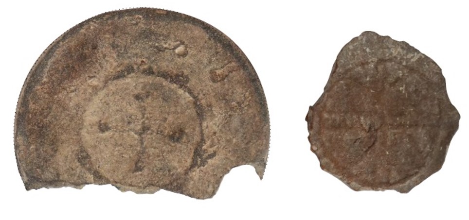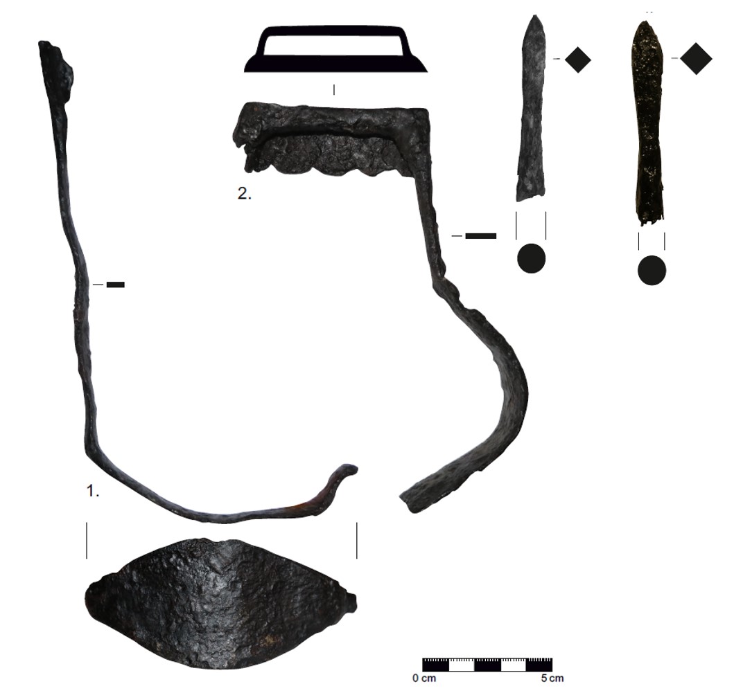 W trakcie badań odkryto liczne fragmenty naczyń ceramicznych z XV-XVII wieku (ryc. 9), a także bogaty zestaw wyrobów metalowych, w tym ozdobne aplikacje pasów (ryc. 10), elementy uzbrojenia (ryc. 11) i wykonany z blachy brązowej kocioł o średnicy 40 cm (ryc. 12). W trakcie badań natrafiono również na monety szwedzkie z okresu „potopu” (1655-1660). To właśnie w tym czasie folwark zakończył swoją działalność.