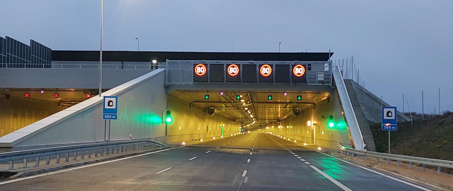 Zdjęcie przedstawia wjazd do tunelu drogowego. Na górze tunelu znajdują się znaki ograniczenia prędkości do 80 km/h, a także sygnalizacja świetlna z zielonymi światłami, co oznacza, że wjazd do tunelu jest dozwolony. Po lewej stronie widoczny jest znak informujący o zbliżającym się parkingu za 500 metrów. Tunel jest dobrze oświetlony, a droga prowadząca do niego jest szeroka i ma wyraźnie oznaczone pasy ruchu. Całość jest otoczona barierkami ochronnymi.