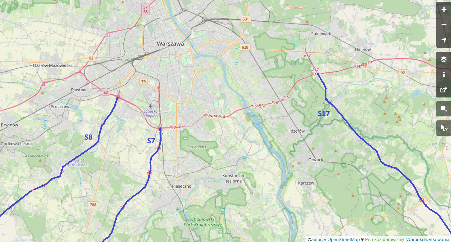 - Płońsk – Warszawa: to 57 km drogi, z których 10 km między Modlinem a Czosnowem będzie udostępnione do ruchu jeszcze w tym roku. Kolejne 25 km z Płońska do Modlina chcemy udostępnić za rok, a 9-kilometrowy odcinek prowadzący do Kiełpina w 2027 roku. Ostatnia część to prawie 13 km S7 prowadzącej bezpośrednio do stolicy. Droga ma już wyznaczony przebieg, przygotowywany jest projekt budowlany dla tej inwestycji. W przyszłym roku planowane jest złożenie wniosku o pozwolenie na budowę (tj. o wydanie decyzji o zezwoleniu na realizację inwestycji drogowej – ZRID).