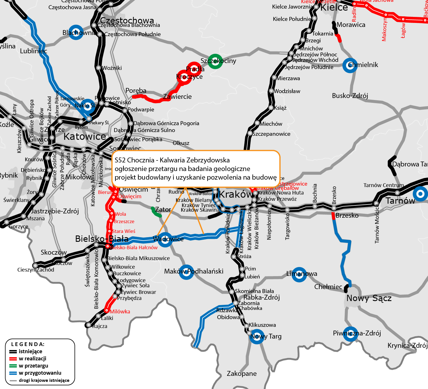 Droga ekspresowa S52 ma obecnie dwa funkcjonujące odcinki, od Cieszyna do Bielska-Białej i od węzła Balice I do węzła Modlniczka. W grudniu 2024 r. dołączyła do nich Północna Obwodnica Krakowa. Wnioski o decyzje ZRID dla czterech odcinków planujemy złożyć w 2027 roku, a po ich uzyskaniu ogłosimy przetargi na realizację trasy. Droga będzie budowana w ramach Rządowego Programu Budowy Dróg Krajowych do 2030 r. (z perspektywą do 2033 r.).