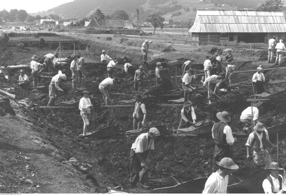 Kolejnej przebudowy drogi dokonano w okresie międzywojennym. W latach 1935-1939 kierownikiem budowy Zakopianki - oznakowanej wówczas na mapach jako droga nr 13 - był inżynier Jan Różycki. Przy okazji tej modernizacji pojawiła się śmiała koncepcja budowy dwupoziomowego skrzyżowania w Skomielnej Białej. Śląski gościniec, czyli dzisiejsza droga krajowa nr 28, miałby biec w wykopie, a droga do Zakopanego przekraczałaby go wiaduktem. W ramach tej przebudowy rozpoczęto budowę przeszło 400-metrowego wiaduktu nad doliną Raby w Chabówce. Prace zostały przerwane 1 września 1939 r. Robotników wyposażono w broń i wraz z Różyckim skierowano do Wysokiej, gdzie trwała bitwa z najeżdżającymi kraj Niemcami. Budowę Zakopianki wraz z wiaduktem dokończyli okupanci. Oni też, wycofując się na zachód w ostatnich miesiącach wojny, wysadzili obiekt w Chabówce. Przez wiele lat pamiątką po czasie okupacji była przypominająca niemieckie autostrady nawierzchnia z betonu położona na niektórych odcinkach.