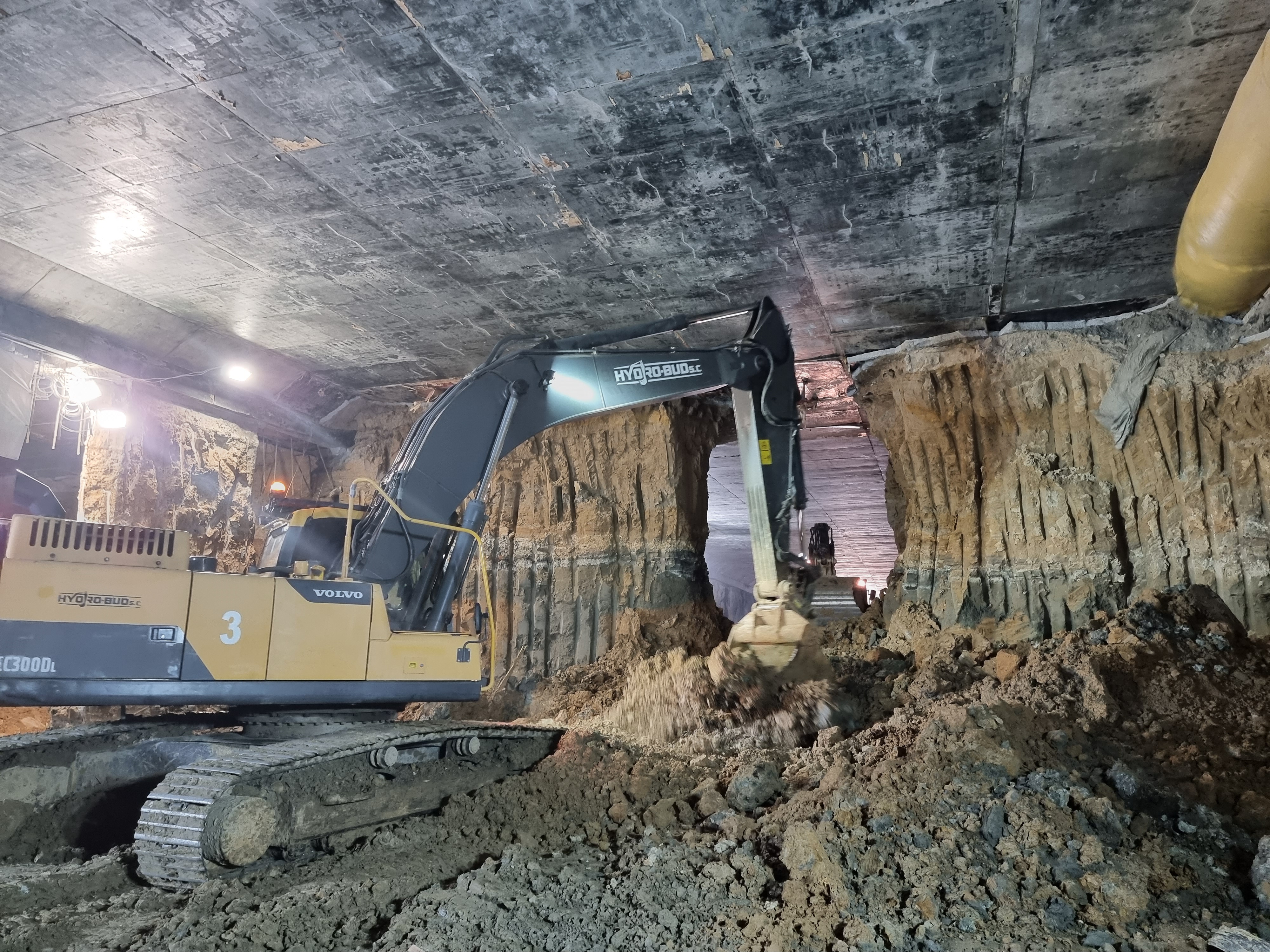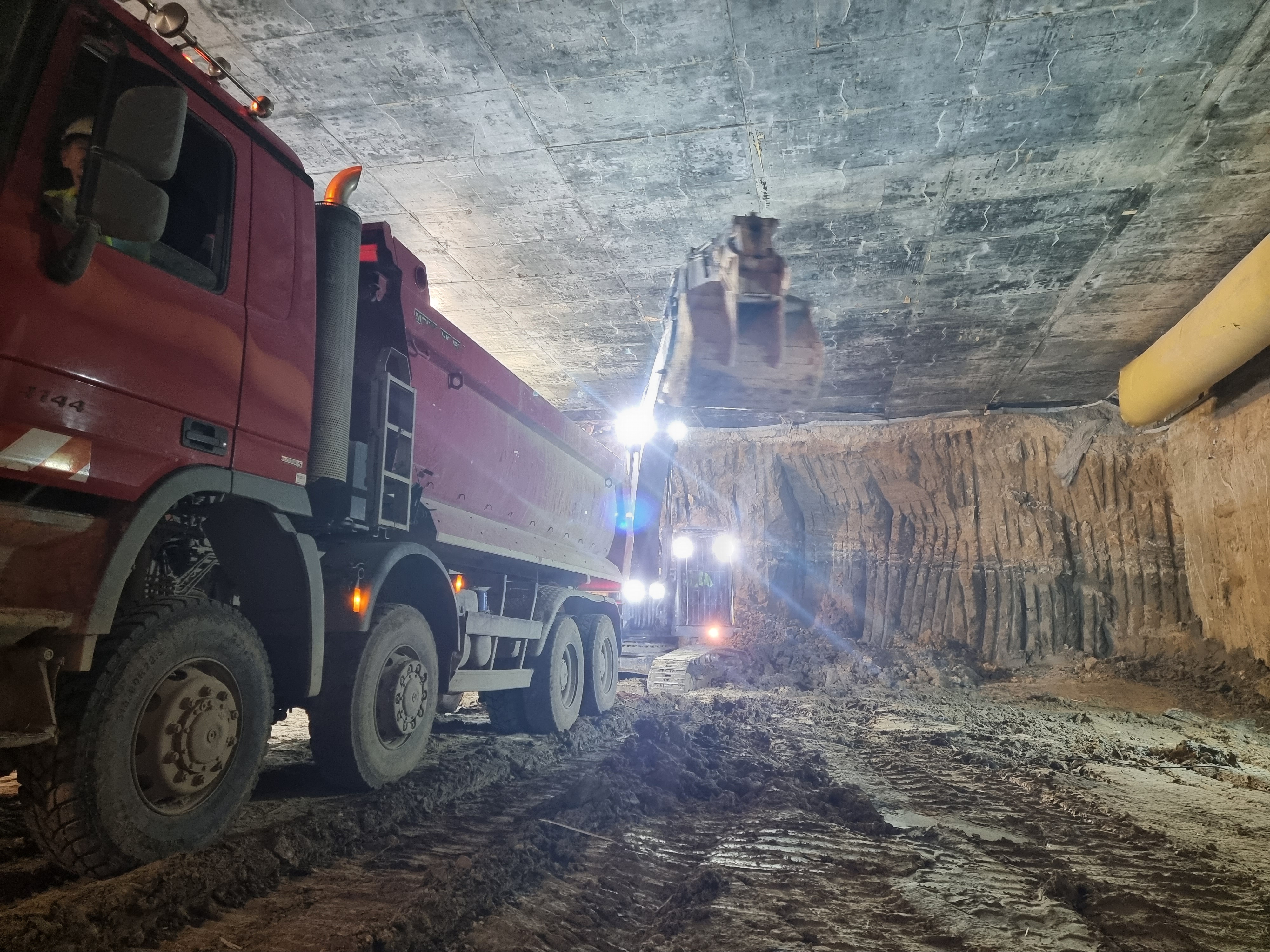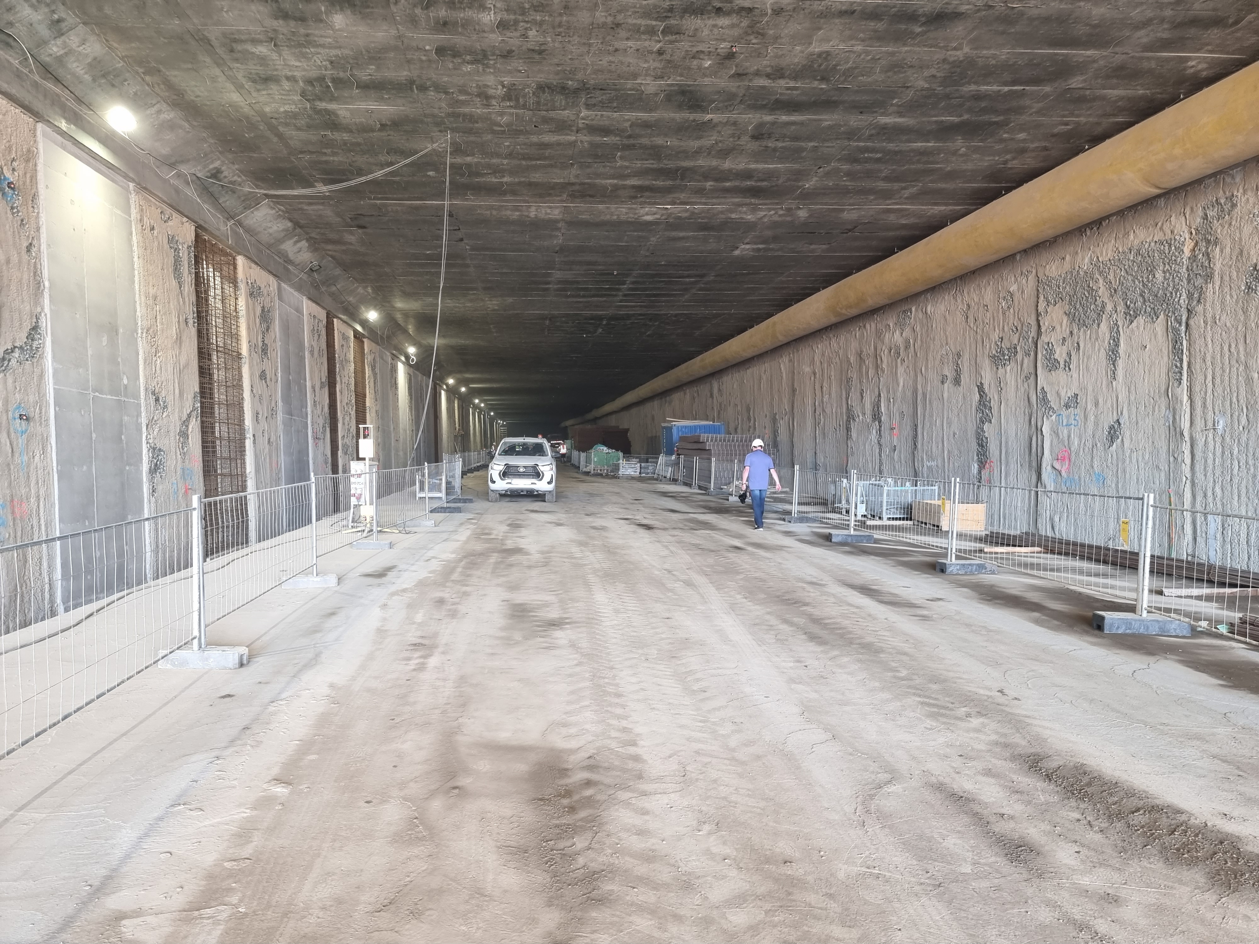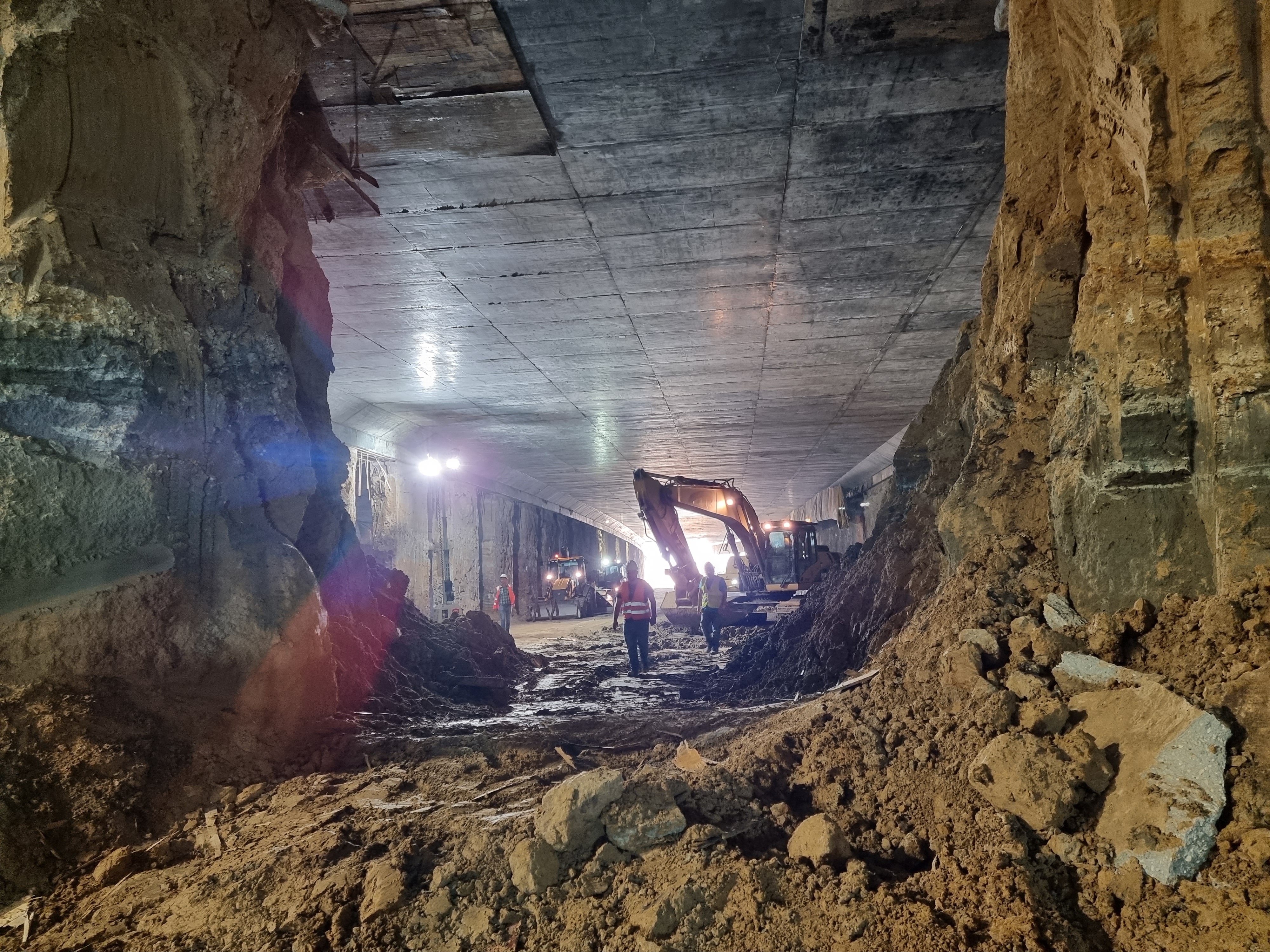 Zanim zakończono usuwanie materiału ziemnego z wnętrza tunelu o długości 496 m, w środku prowadzono już prace żelbetowe związane z wykonywaniem płyty dennej i betonowaniem ścian wypełniających. Wykonywana jest również izolacja stropu tunelu. Zaawansowania prac izolacyjnych wynosi ok. 63 proc. Kontynuowane jest zasypywanie stropu tunelu i ścian bocznych.