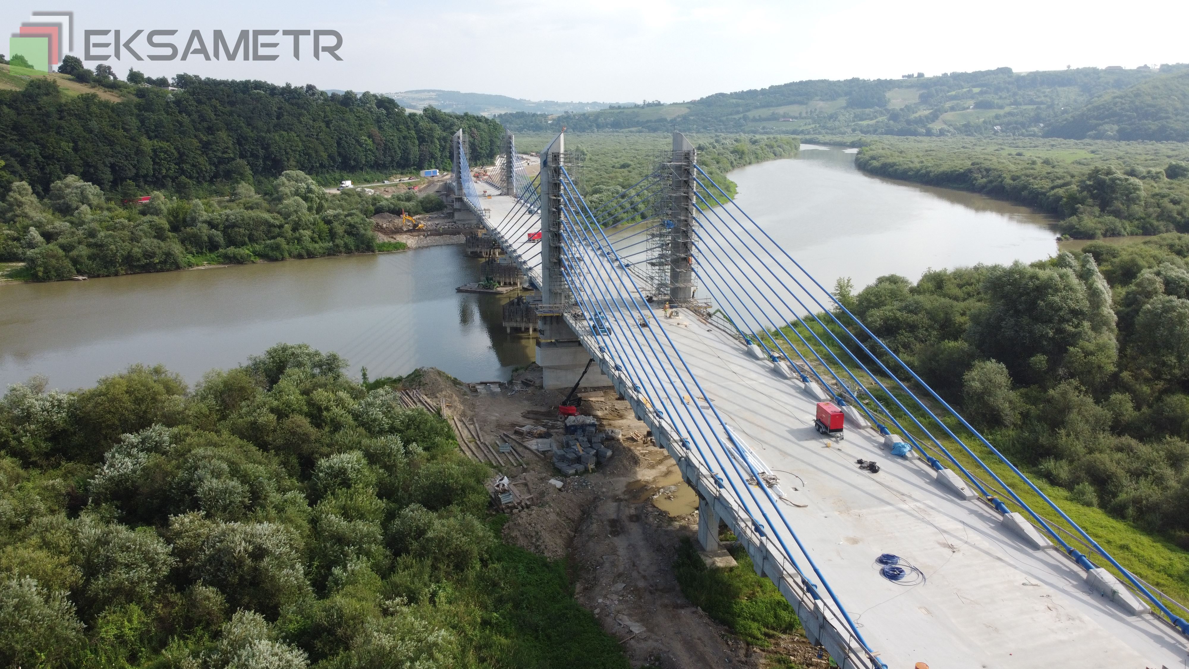 Zakończono już podwieszanie ustroju nośnego wraz z naciąganiem, zamontowanych na pylonach want (lin) podtrzymujących pomost. Oznacza to, że obiekt nie wspiera się już na tymczasowych podporach umieszczonych w rzece. Zaawansowanie prac w branży mostowej wynosi ponad 90 proc.