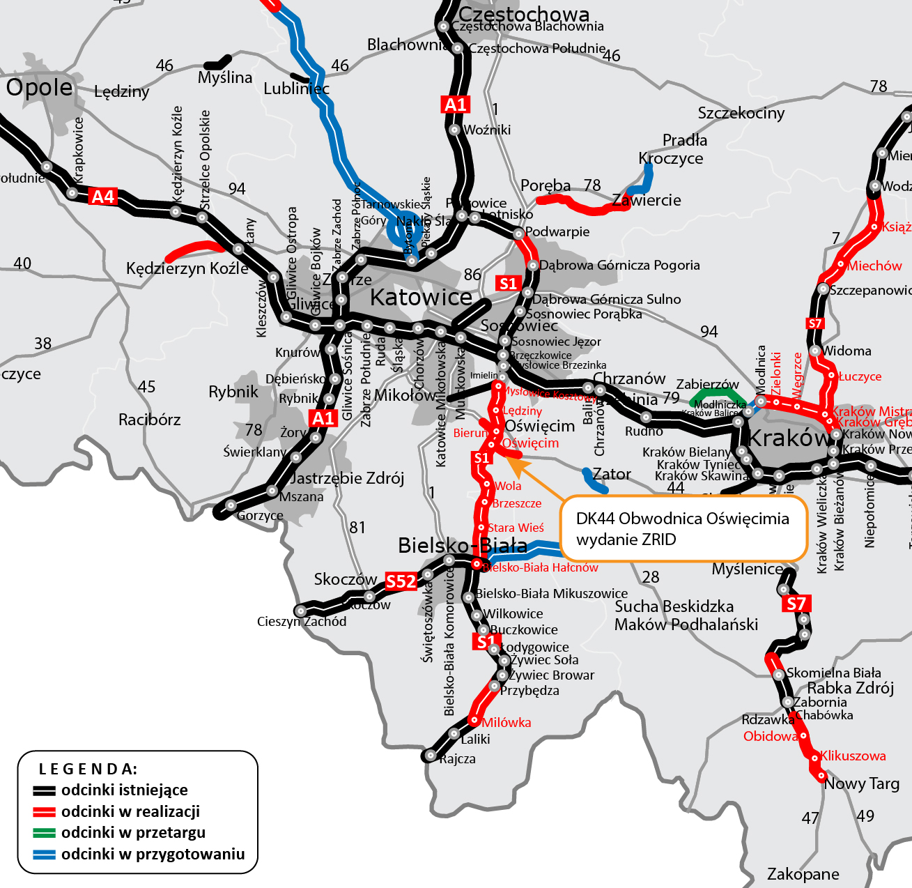W najbliższych dniach przekażemy plac budowy wykonawcy i rozpoczniemy roboty na kolejnym odcinku realizacyjnym drogi ekspresowej S1 pomiędzy Mysłowicami a Bielskiem-Białą, którego częścią jest obwodnica Oświęcimia (DK 44 klasy GP). Wojewoda Małopolski wydał zgodę na realizację inwestycji drogowej (ZRID) dla tej budowy.