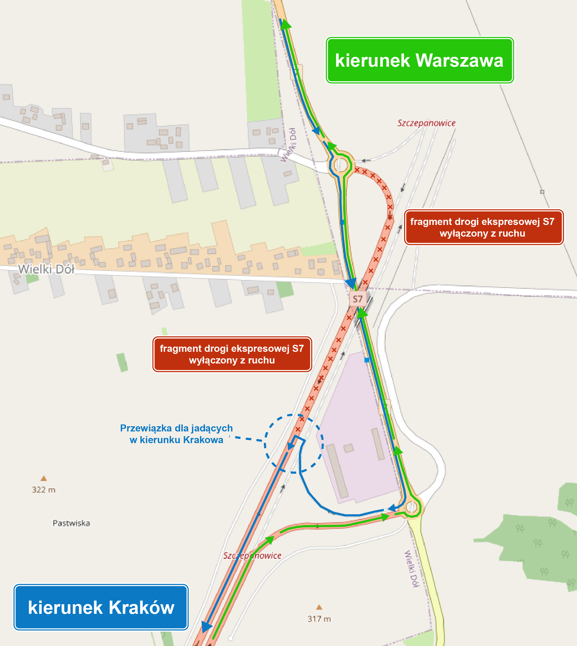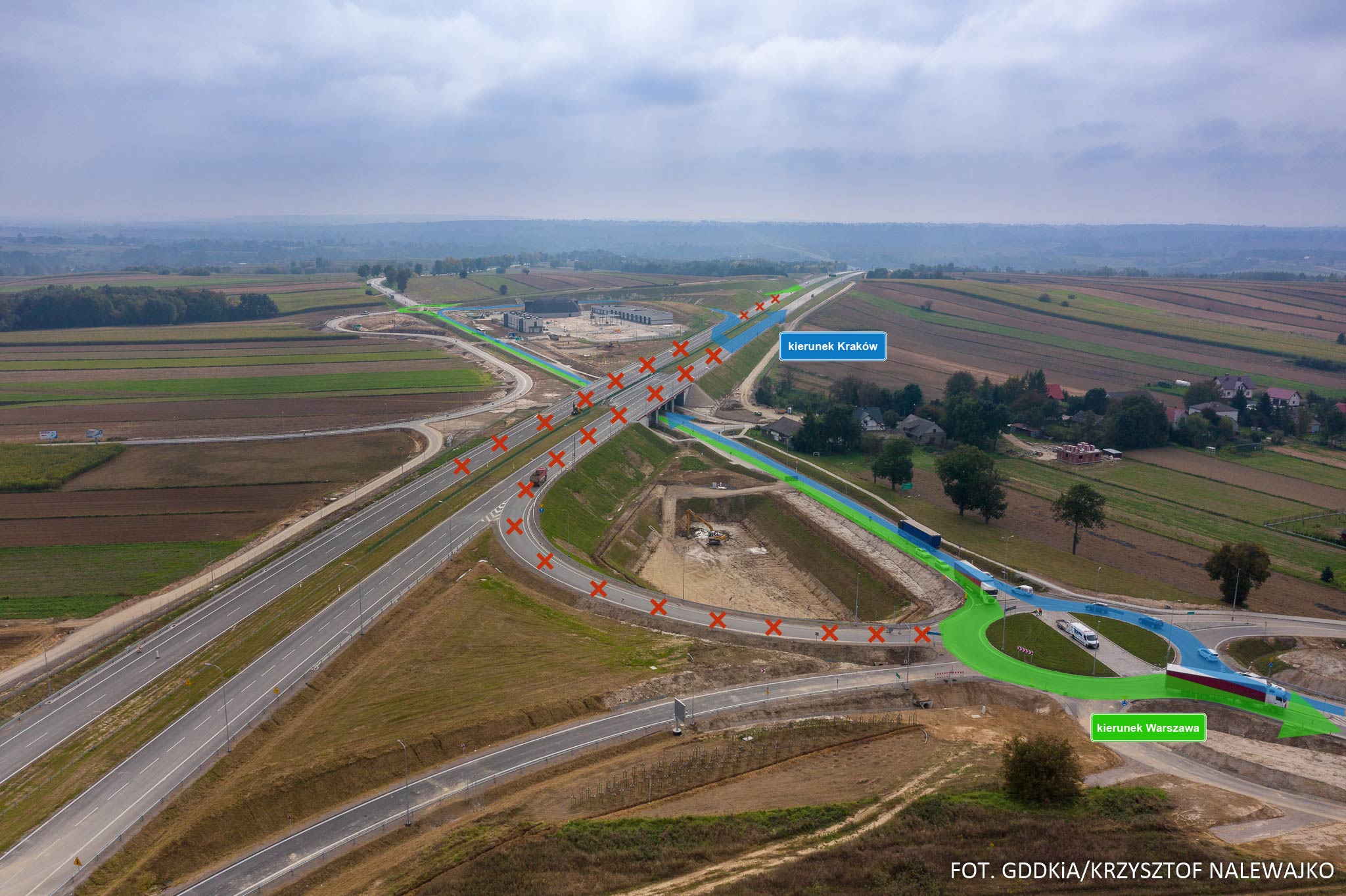 Podjęliśmy decyzję o wprowadzeniu zmian w obecnie funkcjonującej organizacji ruchu. Rozdzielimy kolidujące ze sobą relacje Warszawa - Kraków oraz Kraków - Warszawa. Wjazd i zjazd z S7 będzie możliwy tylko poprzez południowe rondo węzła Szczepanowice i jego łącznice. Dodatkowo powstanie przełączka pomiędzy jezdniami S7, która zapewni ruch w kierunku Krakowa. Taka modyfikacja powinna znacząco usprawnić ruch, choć nie wyeliminuje zakłóceń płynności ruchu w okresach jego wzmożonego natężenia. Nowa organizacja zostanie wdrożona przed Dniem Wszystkich Świętych.