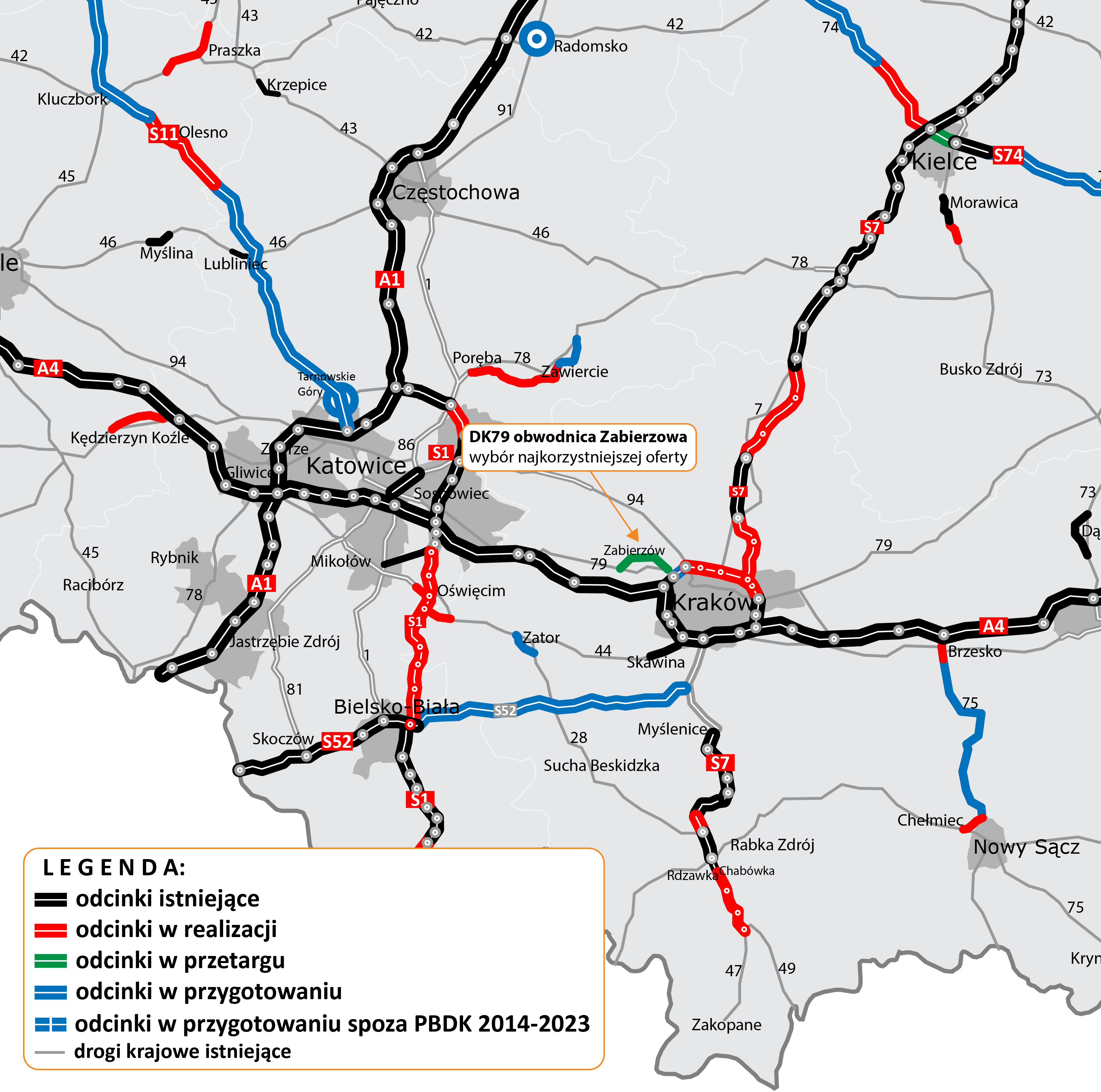 Najkorzystniejszą ofertę w przetargu na budowę obwodnicy Zabierzowa w ciągu DK79 złożyło konsorcjum firm Strabag Polska (lider) i Strabag (partner). Koszt inwestycji wyniesie prawie 590 mln zł. Wybór oferty był możliwy dzięki zwiększeniu środków przeznaczonych na tę inwestycję przez Ministra Infrastruktury.