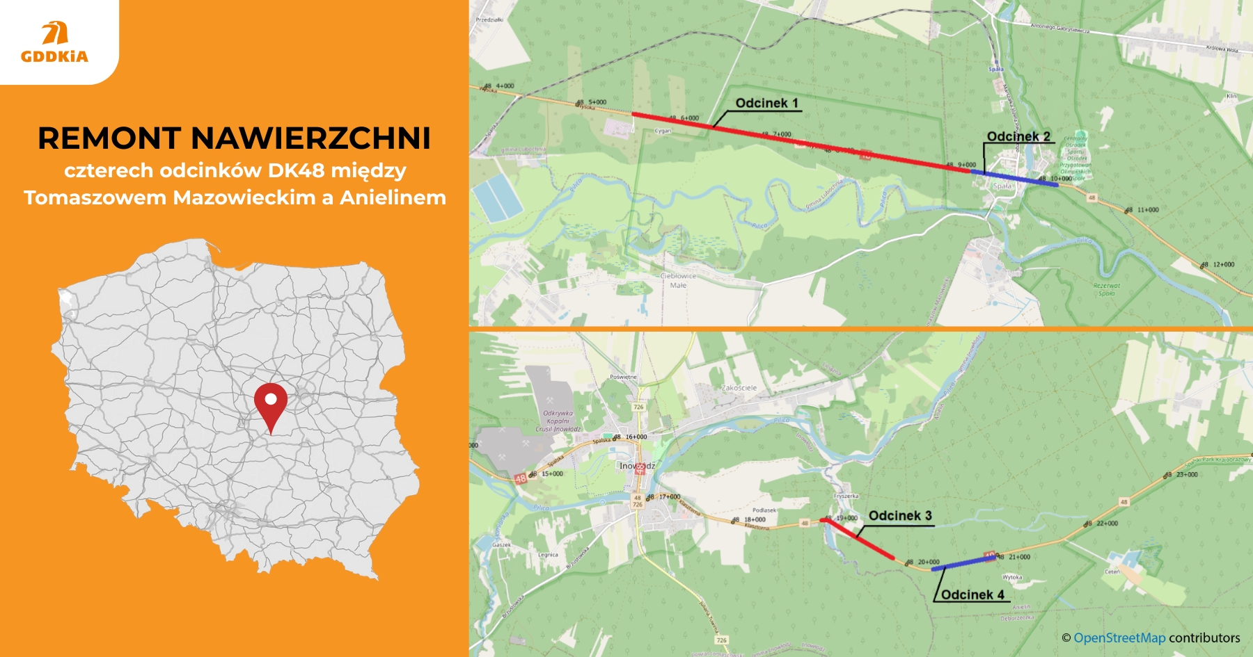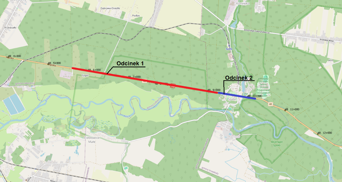 Remont nawierzchni przeprowadzimy na odcinku DK48 za Tomaszowem Mazowieckim w kierunku Radomia. Prace na pierwszym odcinku zaczniemy 800 m przed leśniczówką Cygan i skończymy na wjeździe do Spały (3,6 km). Kolejne dwa, 800-metrowe odcinki, na których przeprowadzimy prace remontowe, znajdują się między Fryszerką i Anielinem.