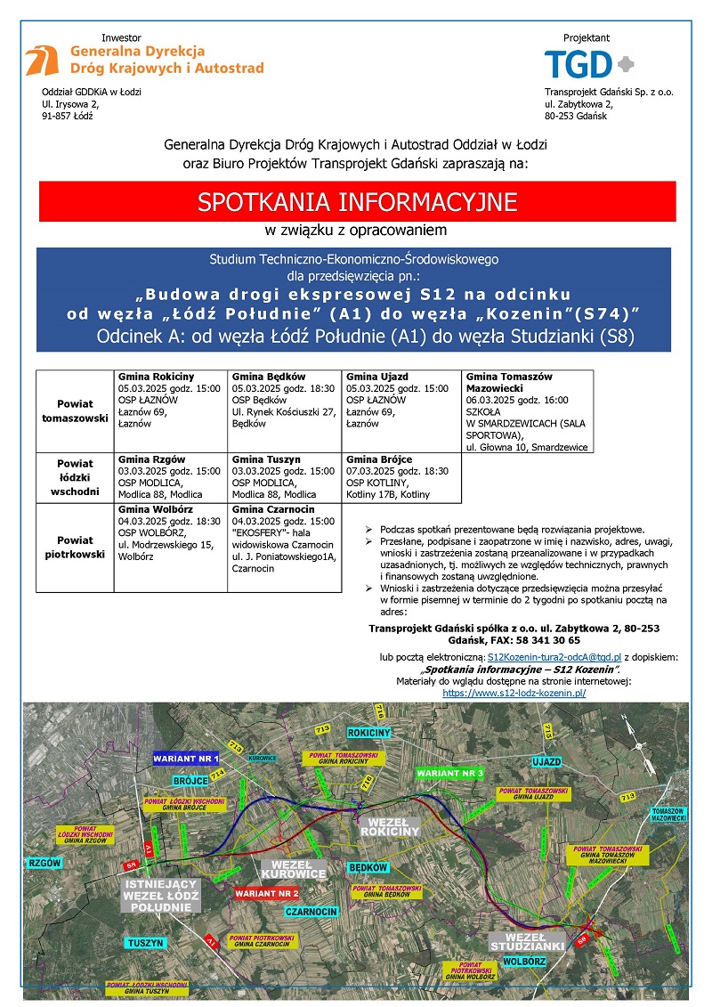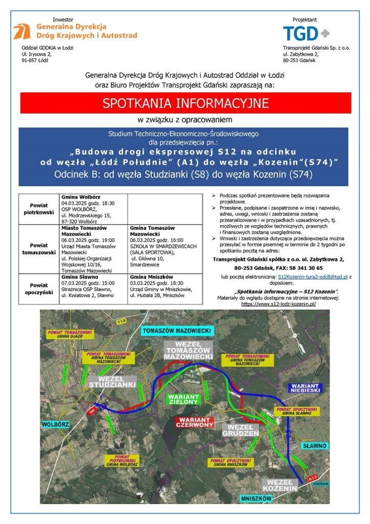 Przypomnijmy, że w grudniu 2023 roku podpisaliśmy umowę na opracowanie Studium techniczno-ekonomiczno-środowiskowego z elementami koncepcji programowej (STEŚ-R) dla połączenia węzła Łódź Południe (A1/S8) z węzłem Kozenin (S12/S74). Niespełna rok później, między 7 a 11 października 2024 roku, odbyła się pierwsza tura spotkań informacyjnych. Wzięli w nich udział mieszkańcy gmin: Rokiciny, Rzgów, Brójce, Czarnocin, Tomaszów Mazowiecki, Ujazd, Wolbórz, Tuszyn, Sławno, Mniszków i miasta Tomaszów Mazowiecki. Projektant zaprezentował wybrany w drodze szczegółowych analiz korytarz przebiegu drogi z trzema potencjalnym wariantami przyszłej trasy. Każdy z wariantów biegnie przez tereny czterech powiatów: łódzkiego wschodniego, piotrkowskiego, tomaszowskiego i opoczyńskiego.