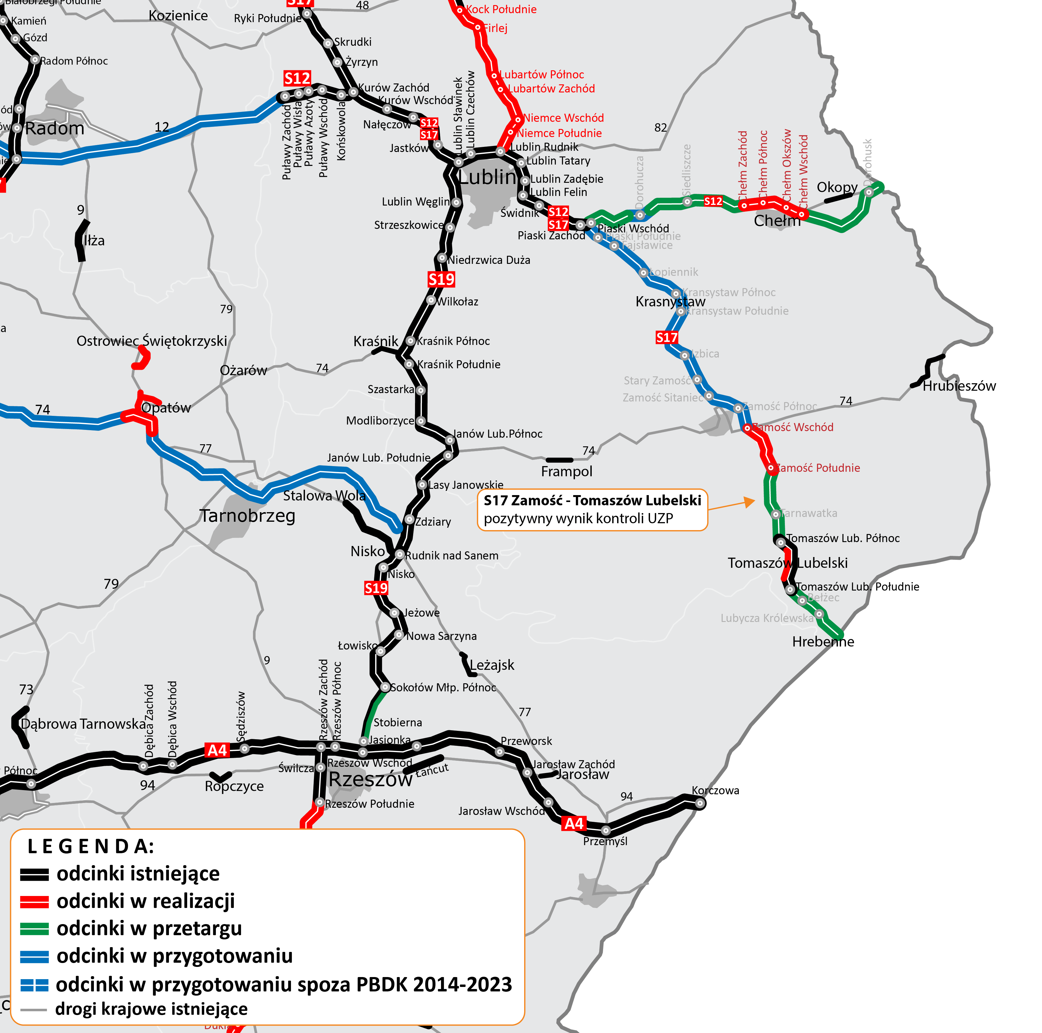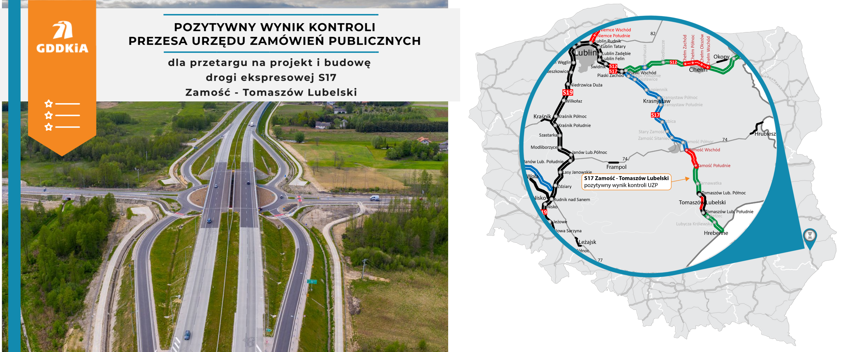 Pozytywnym wynikiem zakończyła się standardowa, uprzednia kontrola przetargu na zaprojektowanie i budowę ponad 18-kilometrowego odcinka drogi ekspresowej S17 od Zamościa do Tomaszowa Lubelskiego, którą przeprowadził Prezes Urzędu Zamówień Publicznych. Podpisanie umowy planowane jest jesienią, po przedstawieniu przez wykonawcę gwarancji należytego wykonania robót.
