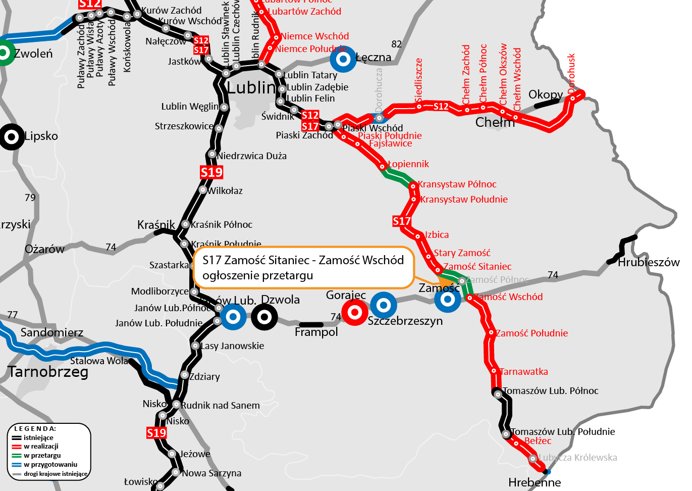 W tegoroczne wakacje rozpoczęły się prace na odcinkach Zamość Wschód – Zamość Południe oraz Tomaszów Lubelski Południe – Hrebenne o łącznej długości prawie 30 km. Niebawem spodziewamy się uzyskania decyzji ZRID dla odcinka Zamość Południe – Tomaszów Lubelski (18,5 km).
