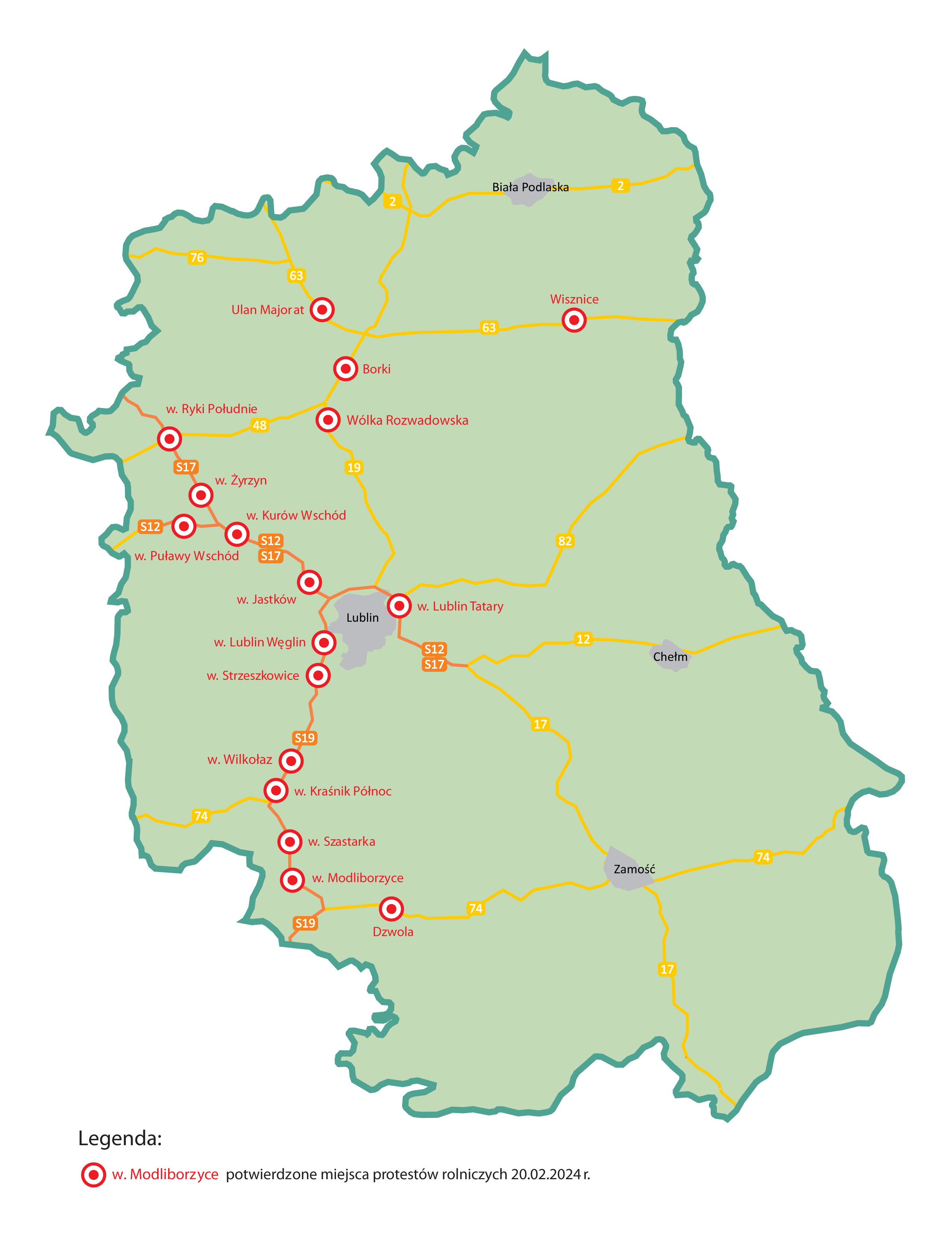 Z godnie z przesłanymi przez organizatorów zapowiedziami protesty mają odbyć się w 17 lokalizacjach na drogach krajowych w Lubelskiem. Rolnicy zapowiadają, że całkowicie zablokują niektóre odcinki dróg ekspresowych S12, S17 oraz S19 (w tym na obwodnicy Lublina) wraz z węzłami drogowymi. Ze względów bezpieczeństwa odcinki te będą wyłączone z ruchu, a pojazdy osobowe oraz ciężarowe będą musiały się kierować na drogi alternatywne. Informacje o utrudnieniach będą wyświetlane na znakach zmiennej treści.