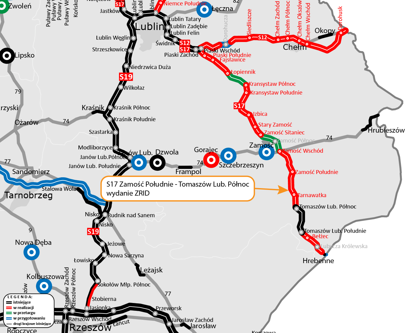 Wojewoda Lubelski wydał decyzję o zezwoleniu na realizację inwestycji drogowej (ZRID) dla ponad 18-kilometrowego odcinka drogi ekspresowej S17 od Zamościa do Tomaszowa Lubelskiego. Tym samym w budowie są już trzy fragmenty tej trasy, o łącznej długości niespełna 50 km, prowadzące w kierunku przejścia granicznego w Hrebennem.