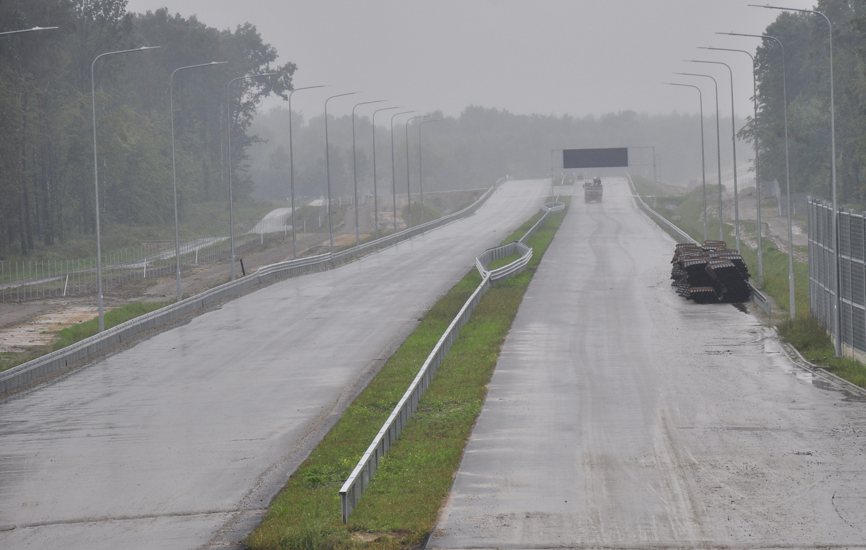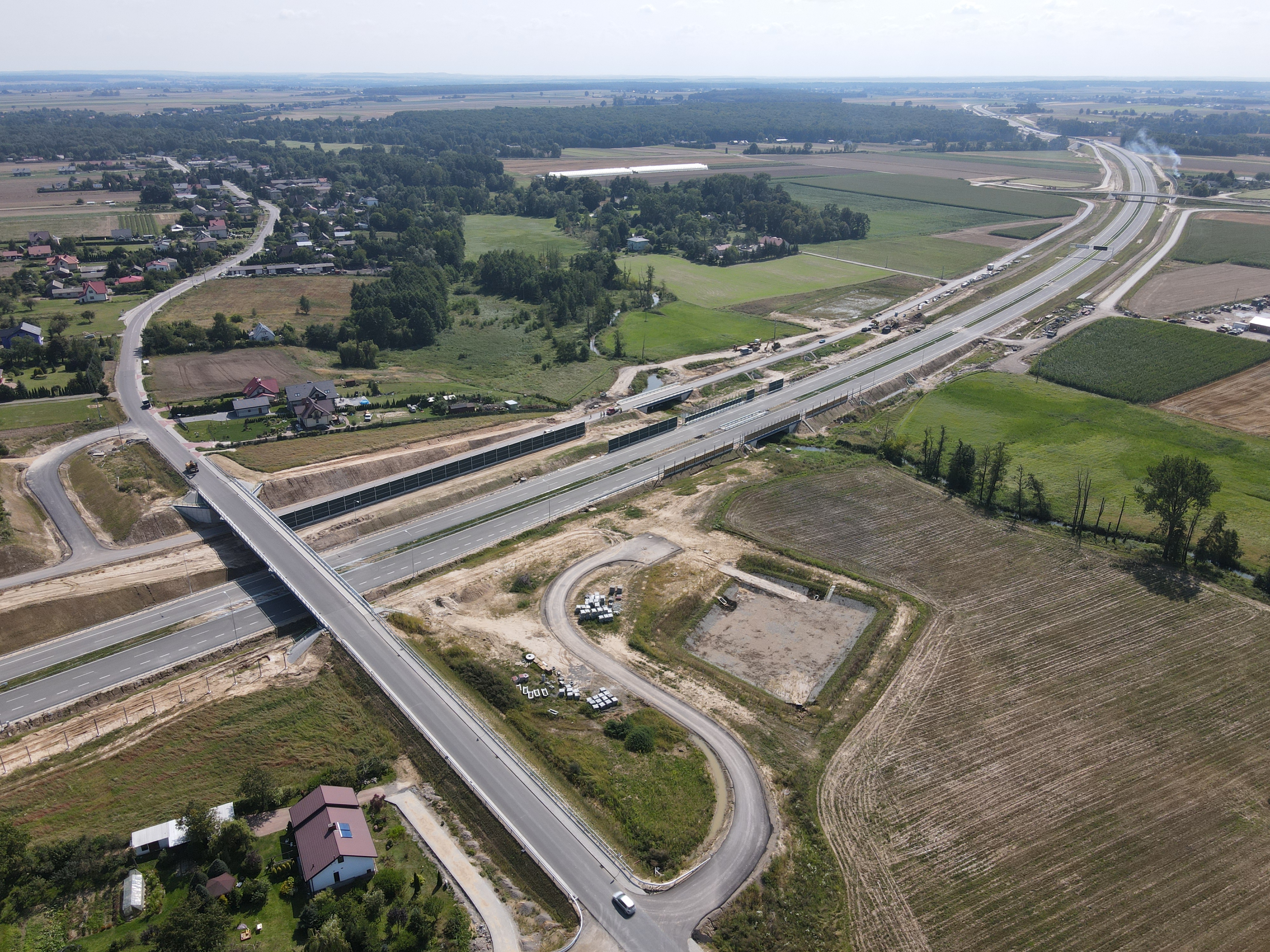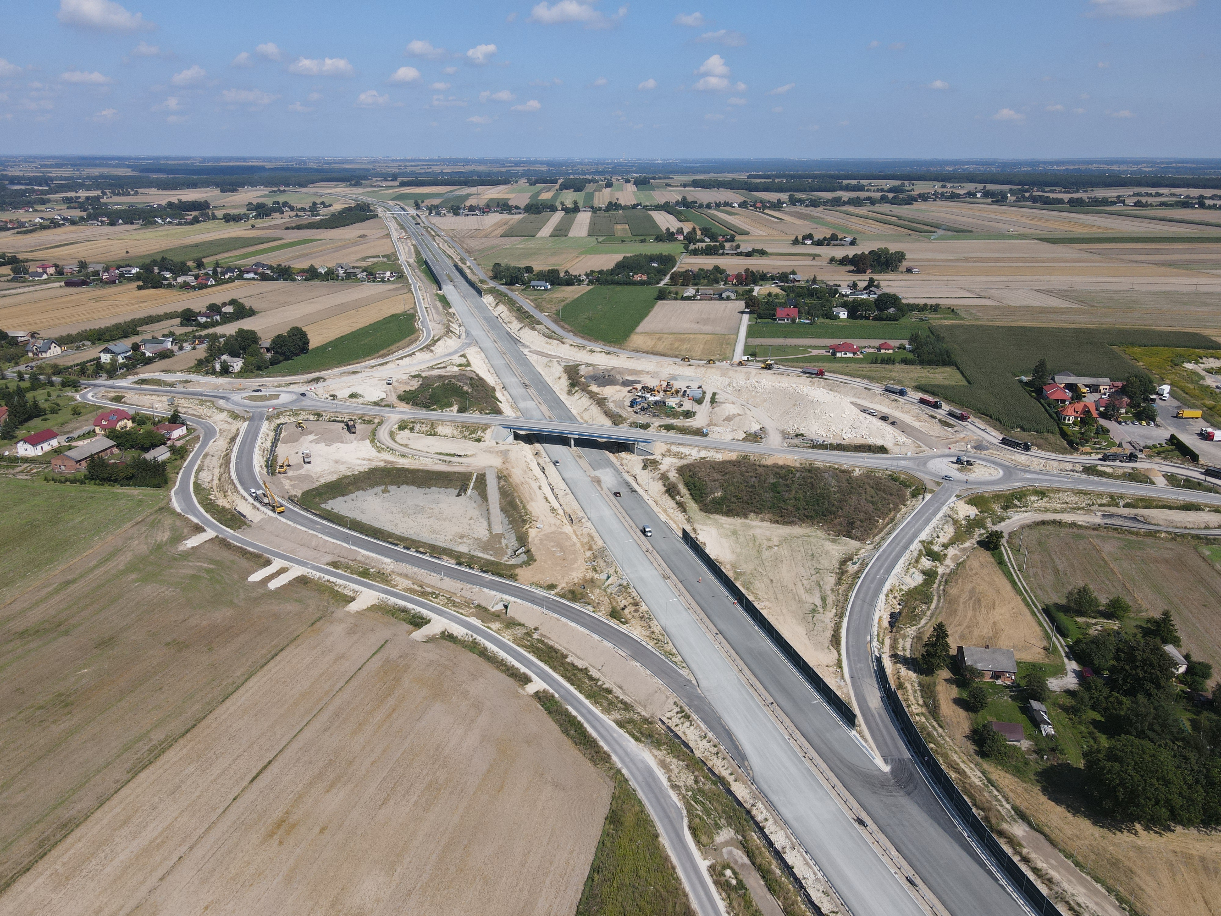 Zaawansowanie rzeczowe wynosi ok. 88 proc. Na obu jezdniach trasy głównej ułożona jest masa bitumiczna. Obecnie Wykonawca kończy prace związane z układaniem warstwy ścieralnej, a więc ostatniej warstwy nawierzchni. W związku z tym niedawno zmieniła się organizacja ruchu na drodze krajowej nr 19, który został przeniesiony na prawą jezdnię powstającej drogi ekspresowej i poprowadzony przez węzeł Strzeszkowice. Wykonawca prowadzi także prace wykończeniowe na trasie głównej i obiektach inżynierskich, realizowane są roboty brukarskie, a także zabezpieczające. Ustawiane są ekrany akustyczne, oświetlenie, wykonywane jest odwodnienie i prowadzone są prace przy budowie MOP. Zakończenie prac planowane jest w IV kwartale tego roku.