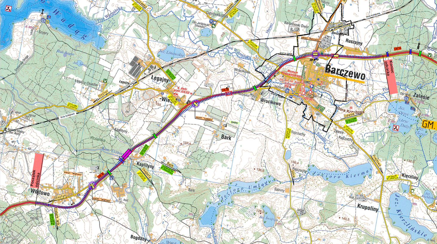 W ramach dwóch zadań, w śladzie obecnej DK16, powstanie droga klasy S o długości blisko 30 km. Istniejąca droga zostanie dostosowana do parametrów klasy S, zarówno dzięki dobudowie drugiej jezdni, jak i przebudowie konstrukcji niektórych odcinków istniejącej drogi. Wybudowane zostaną także dodatkowe jezdnie umożliwiające obsługę przyległych terenów. Powstaną nowe węzły drogowe Wójtowo oraz Łęgajny, natomiast węzły Barczewo, Kromerowo i Biskupiec zostaną dostosowane do parametrów klasy S. Inwestycja obejmie także budowę obiektów inżynieryjnych, montaż urządzeń ochrony środowiska, w tym ekranów akustycznych, budowę przejść dla zwierząt, odwodnienia i oświetlenia drogi. Wykonany zostanie system zarządzania ruchem (SZR) wraz z systemem preselekcyjnym (stacja ciągłego pomiaru ruchu). Powstaną dwa Miejsca Obsługi Podróżnych (MOP) i obwód utrzymania drogi ekspresowej w rejonie węzła Biskupiec.