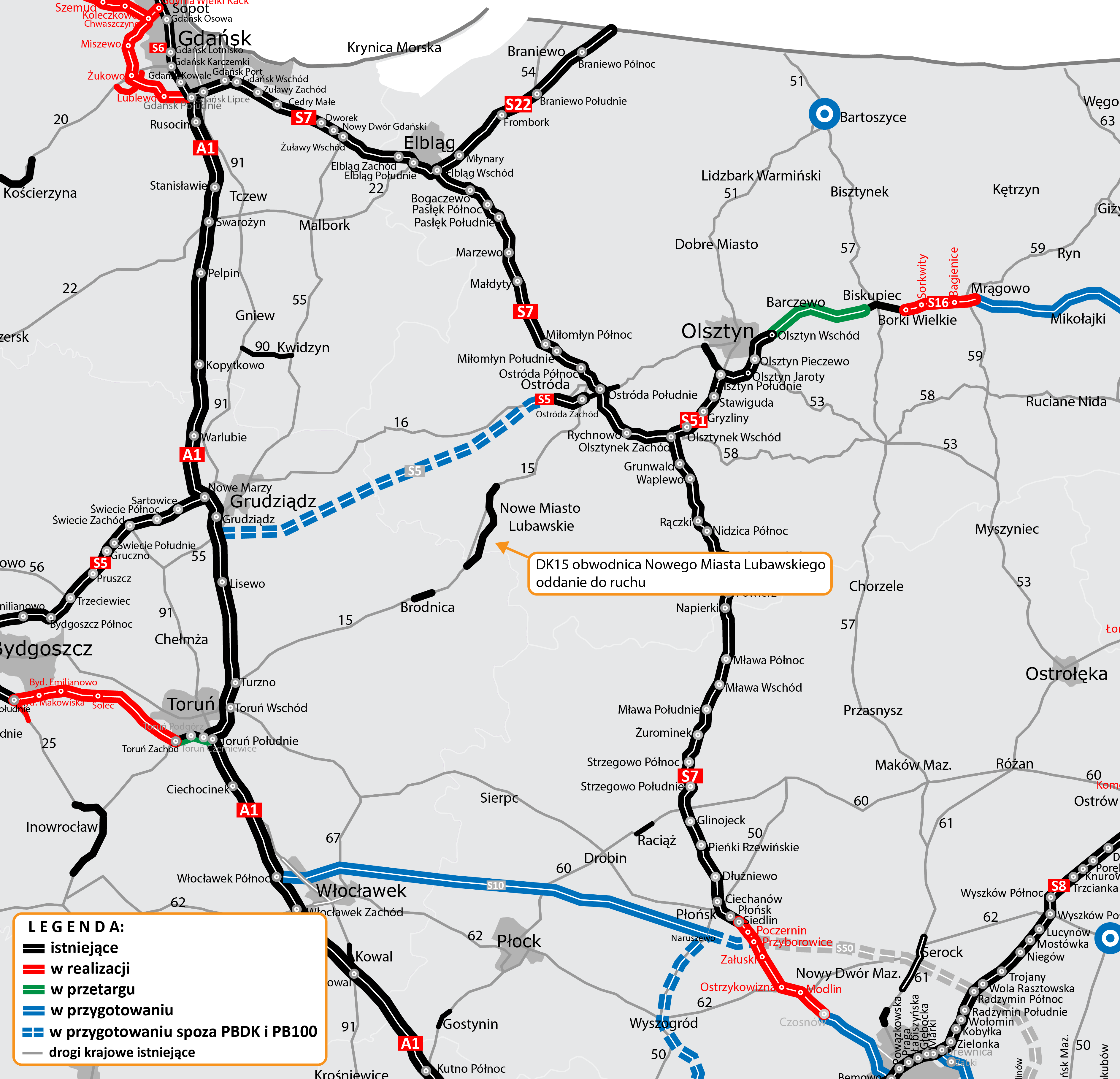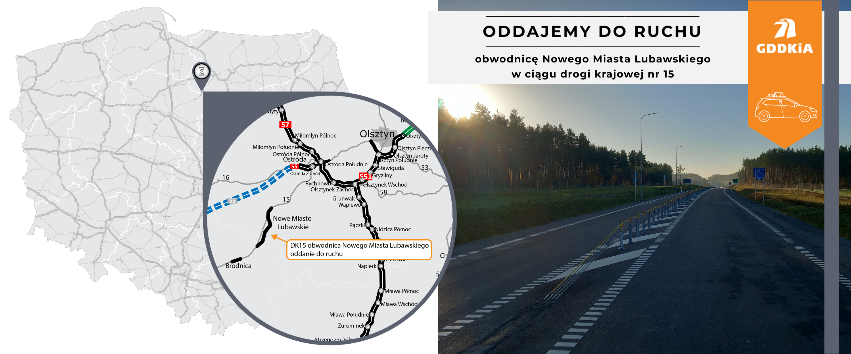 Zakończyły się prace na budowie obwodnicy Nowego Miasta Lubawskiego w ciągu drogi krajowej nr 15. Kierowcy omijają miejscowość od wschodu drogą o długości około 18 km. Wykonawcą zadania było konsorcjum firm Porr z Warszawy i Porr Bau z Wiednia.
