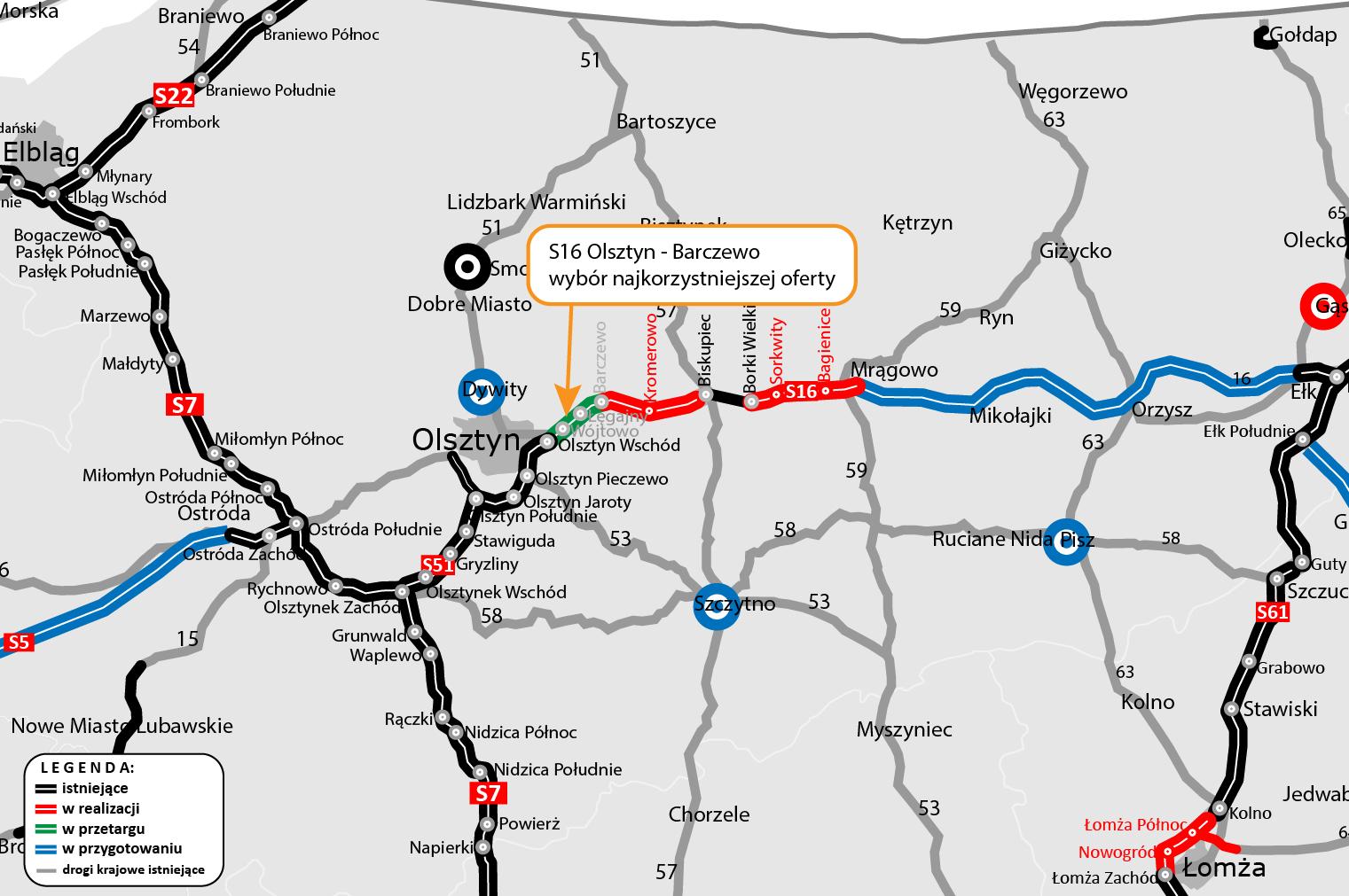 W śladzie obecnej DK16 pomiędzy Olsztynem i Biskupcem, którą oddaliśmy do ruchu w 2010 r., powstanie droga ekspresowa S16 o długości blisko 30 km. Realizację podzieliliśmy na dwa odcinki: Olsztyn – Barczewo i Barczewo – Biskupiec. Dla tego drugiego odcinka, o długości ponad 18 km, w czerwcu br. podpisaliśmy umowę z wykonawcą. Istniejąca droga zostanie dostosowana do parametrów klasy S dzięki dobudowie drugiej jezdni, jak i przebudowie konstrukcji niektórych odcinków istniejącej drogi. Wybudowane zostaną także dodatkowe jezdnie umożliwiające obsługę przyległych terenów. Powstaną nowe węzły drogowe Wójtowo oraz Łęgajny, natomiast węzły Barczewo, Kromerowo i Biskupiec zostaną dostosowane do parametrów drogi ekspresowej.
