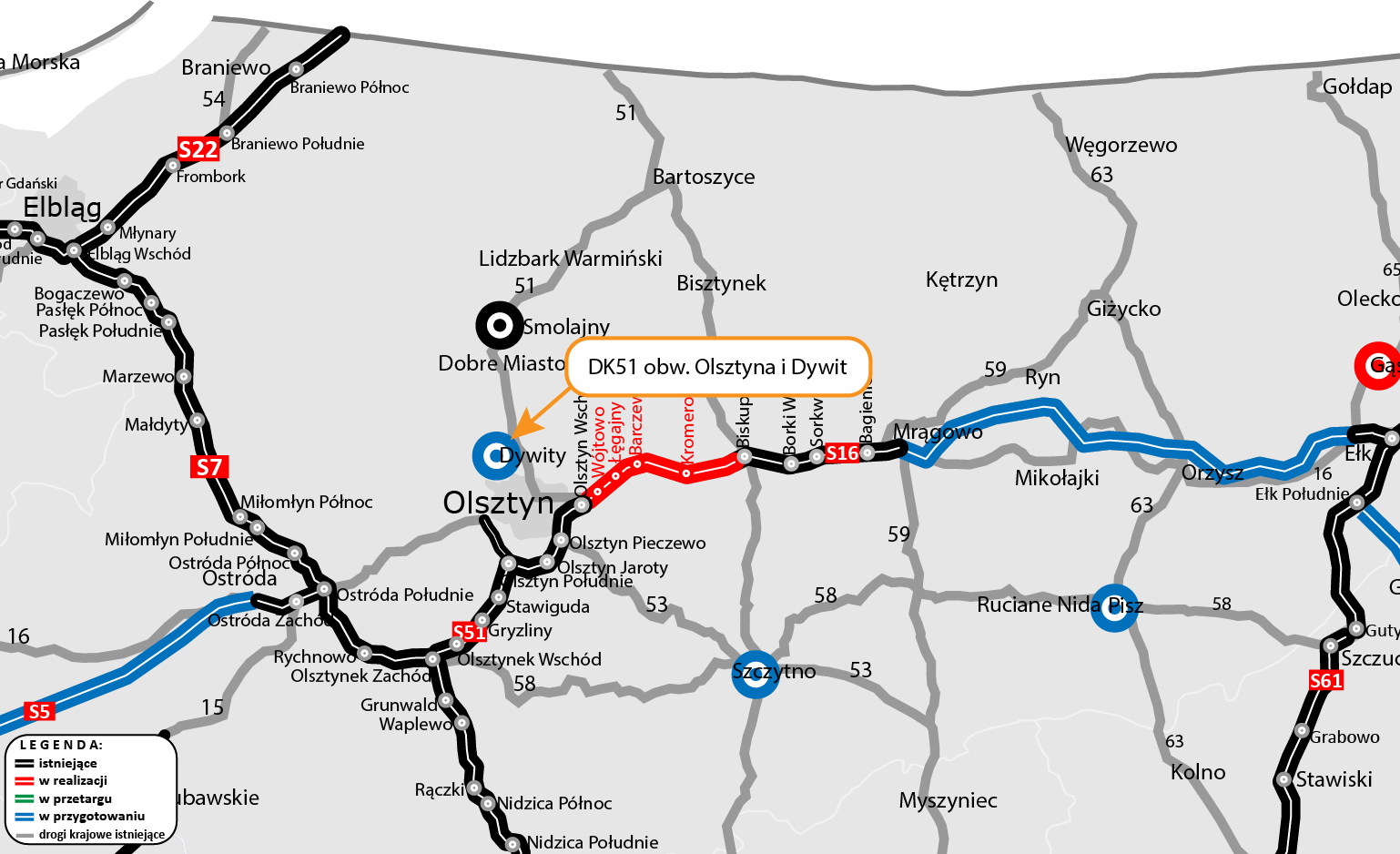 Budowa obwodnicy Olsztyna jest jednym z pięciu zadań z rządowego Programu budowy 100 obwodnic w woj. warmińsko-mazurskim. Od sierpnia 2022 r. kierowcy omijają już centrum Smolajn, na etapie realizacji jest obwodnica Gąsek w ciągu DK65, a do 2030 r. powstaną obwodnice Pisza w ciągu DK63 i DK58 oraz Szczytna w ciągu DK53, DK57 i DK58 (obie są na etapie opracowywania Studium techniczno-ekonomiczno-środowiskowego z elementami koncepcji programowej).